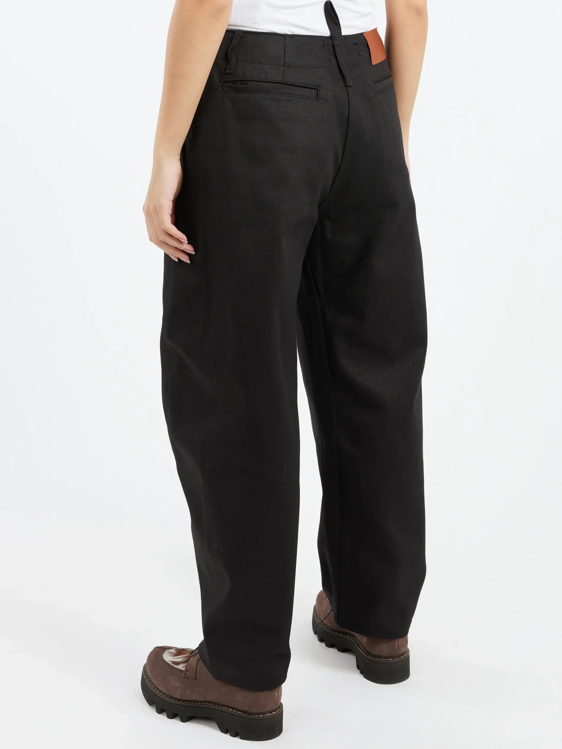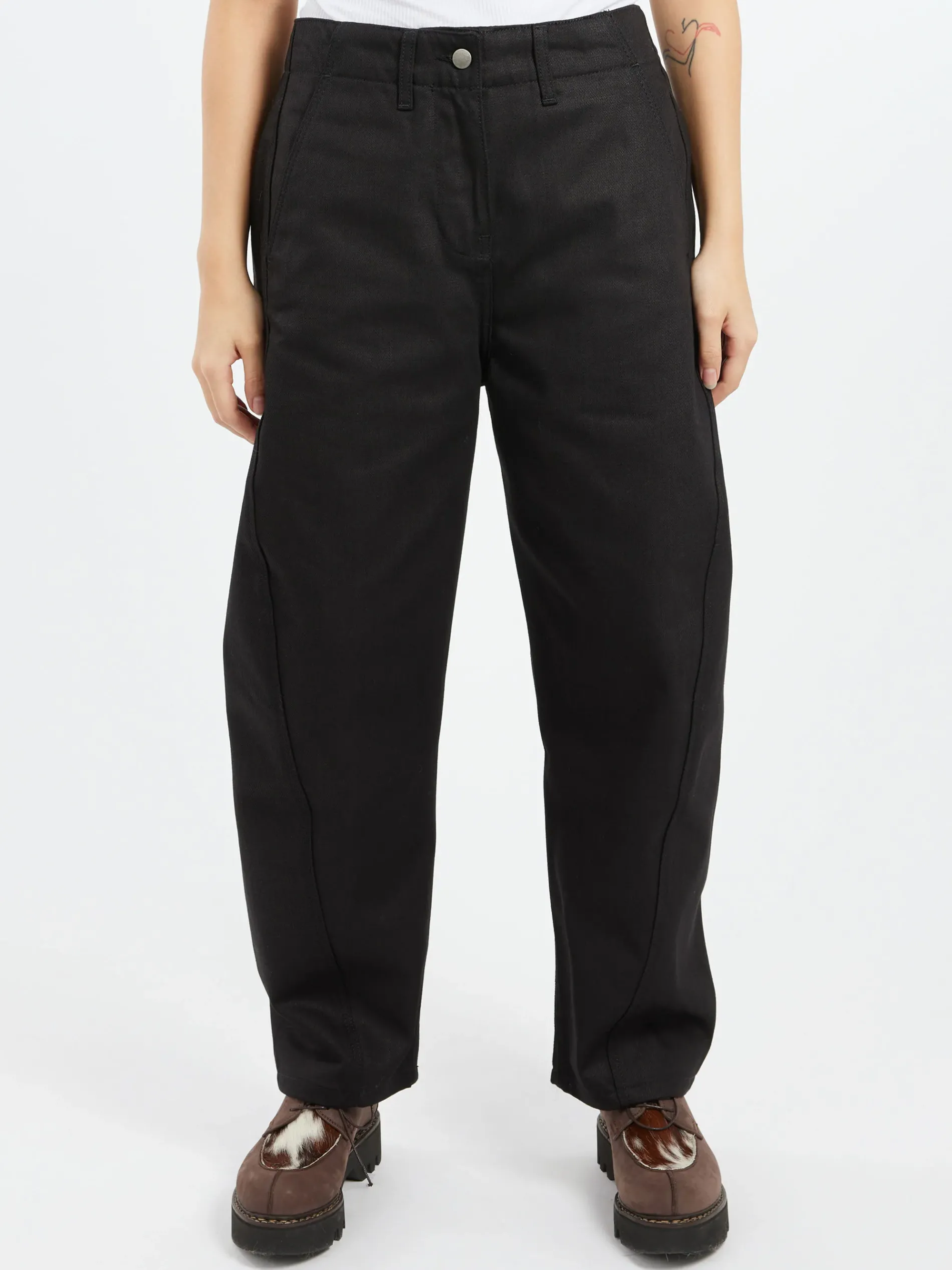 High waisted curved leg denim pant made from ISKO’s sustainable raw R-TWO™ denim.