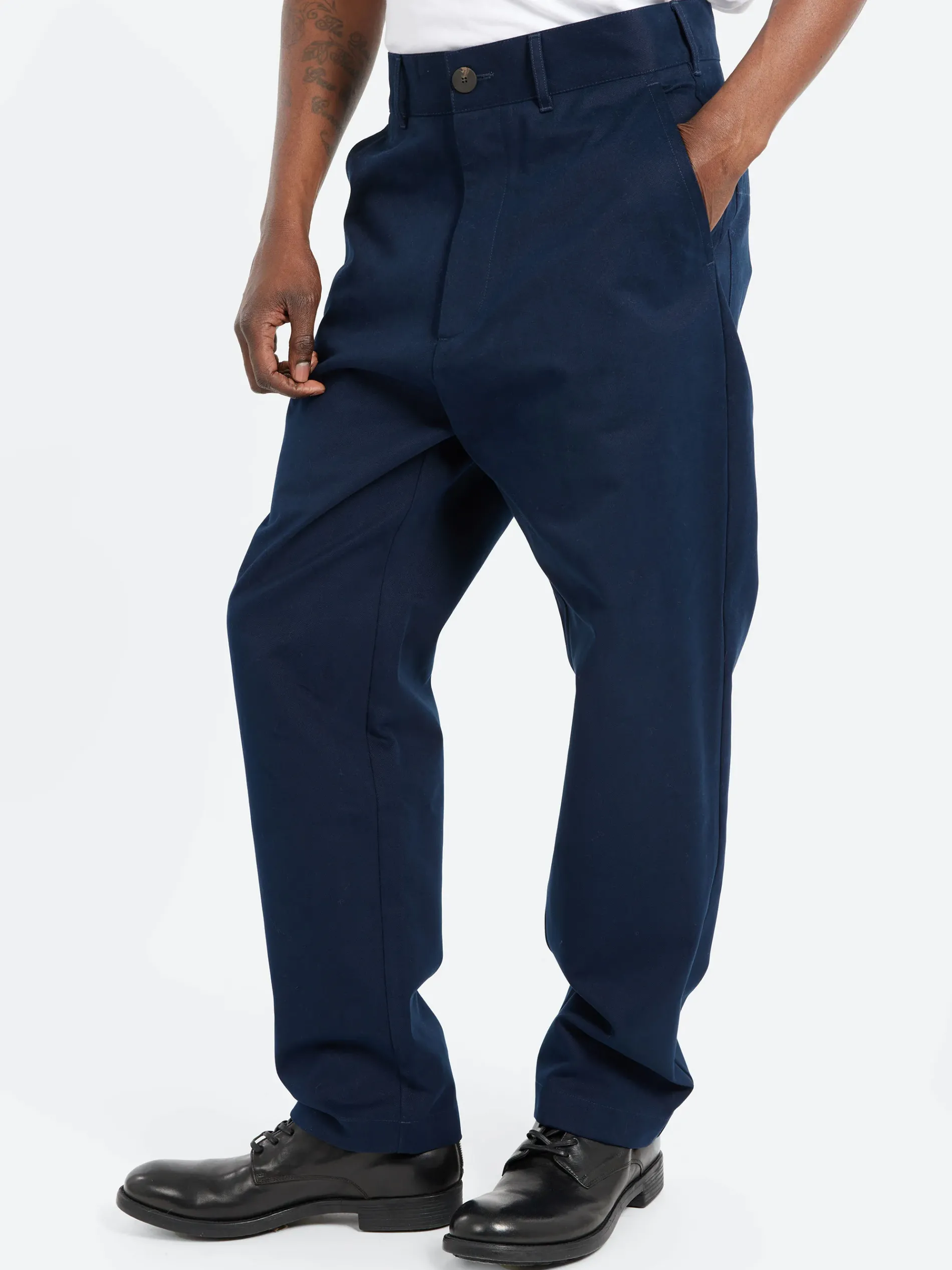 High-waisted flat front pant made from Studio Nicholson’s signature Italian peached cotton.