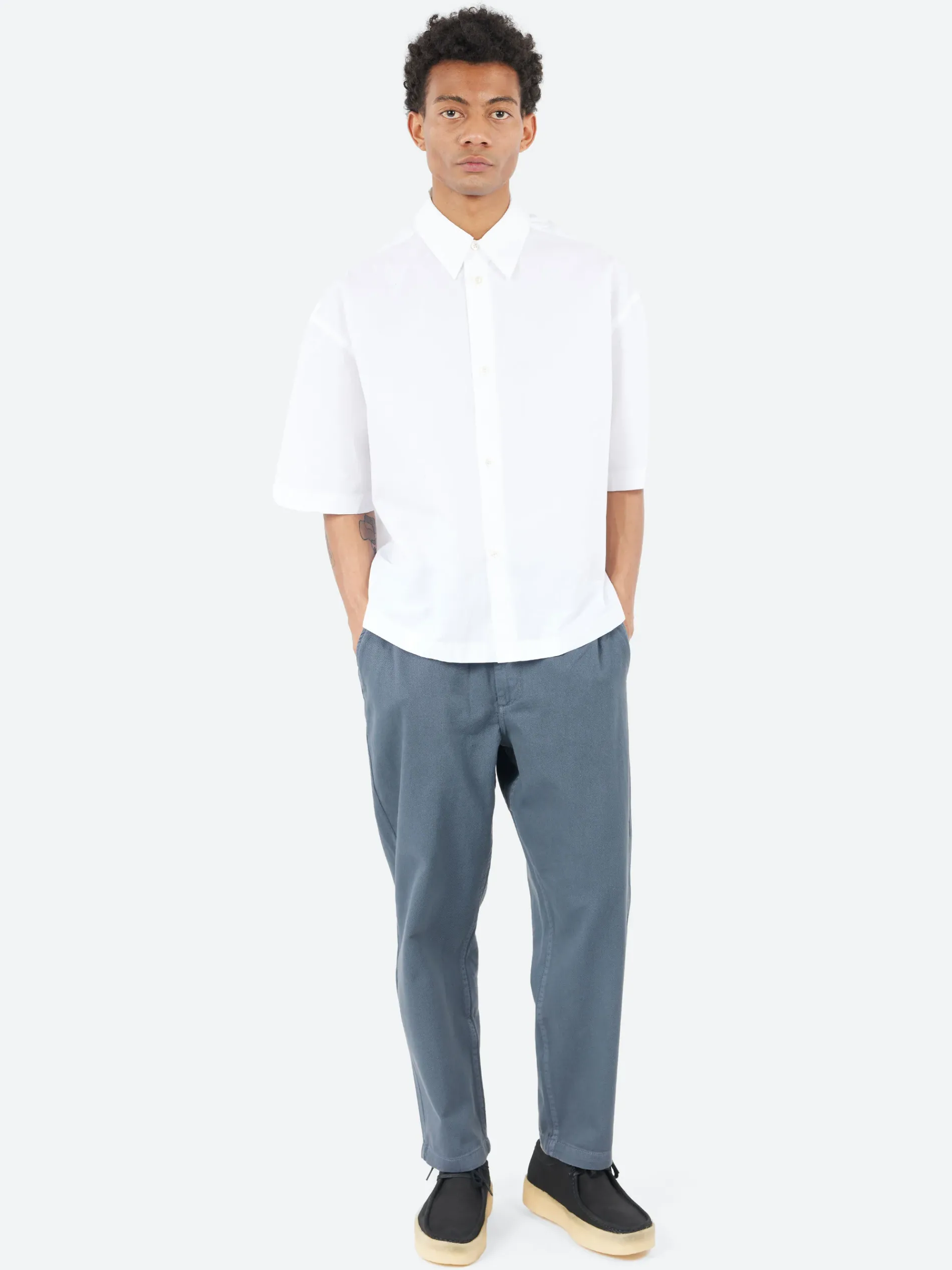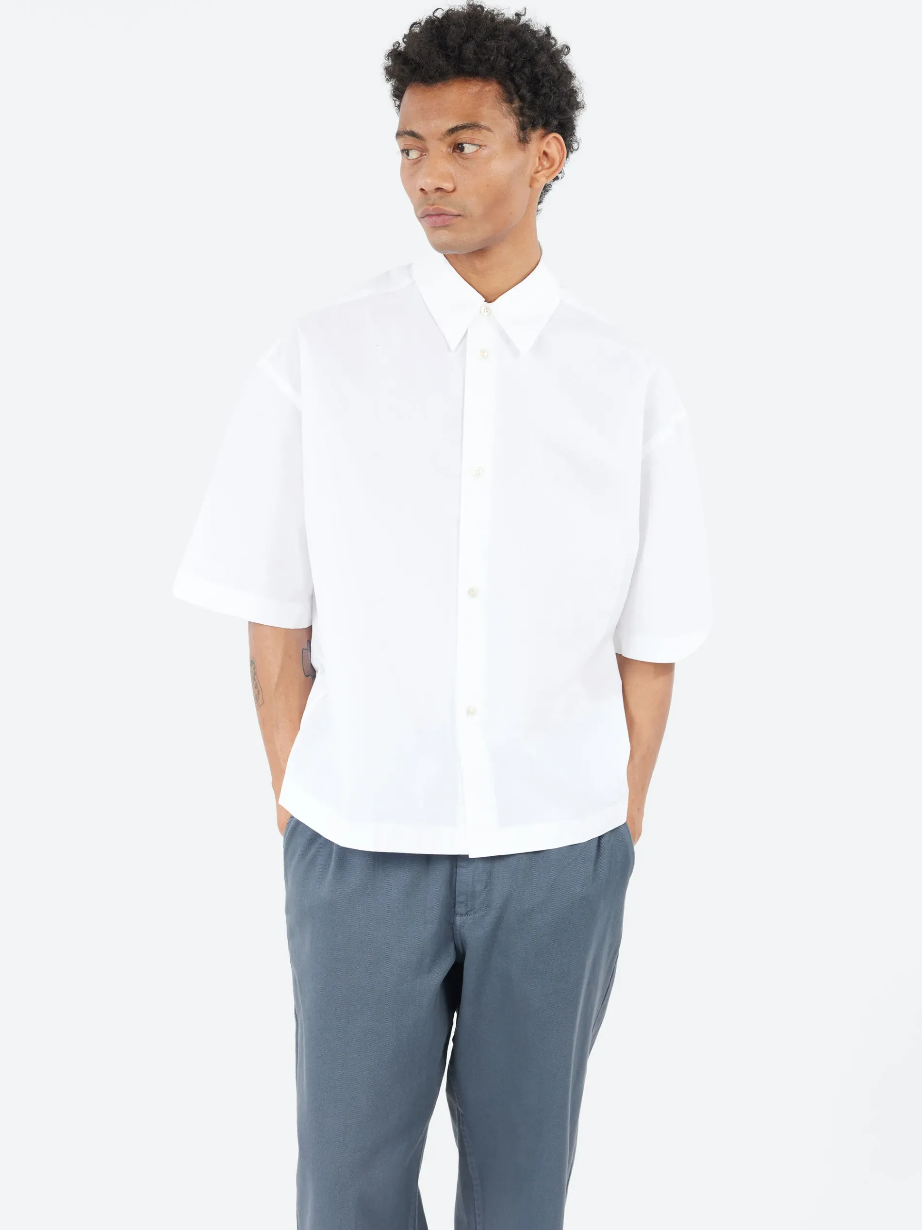The short-sleeved Sanko shirt is cut from Italian organic cotton poplin that has a crisp handle and is washed for a soft cashmere-like surface. With a broad cut and dropped shoulder, it exudes a casual coolness that’s ideal for warmer days.