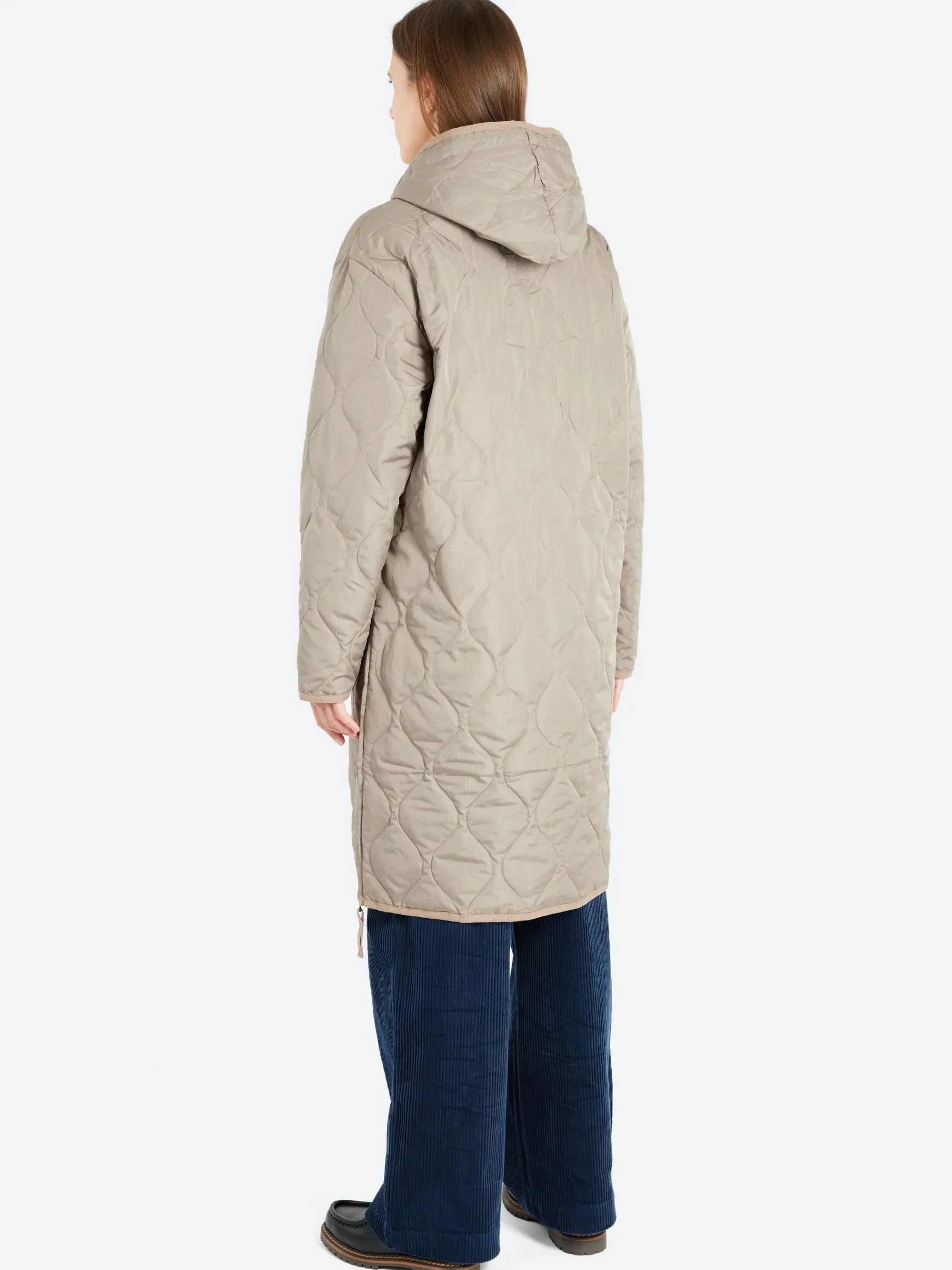 TAION hooded down coat with a clean neckline. The side zips on both sides make it easier to move by increasing the range of motion, making it easy to put your hands in the bottom pocket.