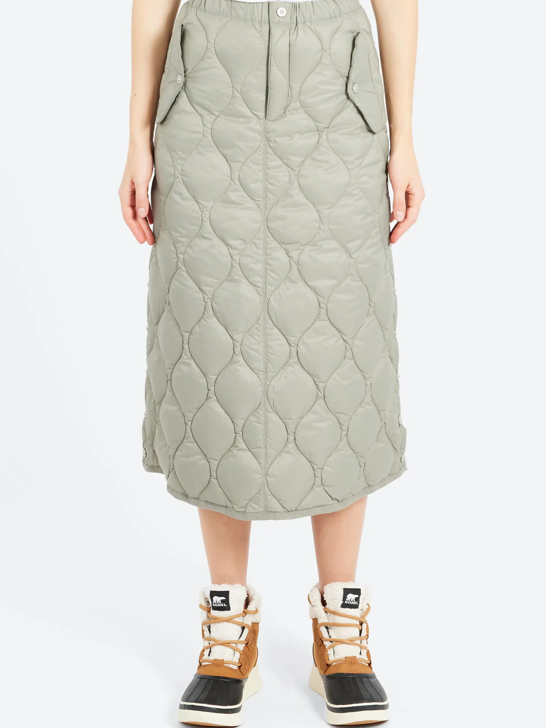 TAION semi-flared military down long skirt made with SOFT SHELL. The side slits allow for plenty of movement.