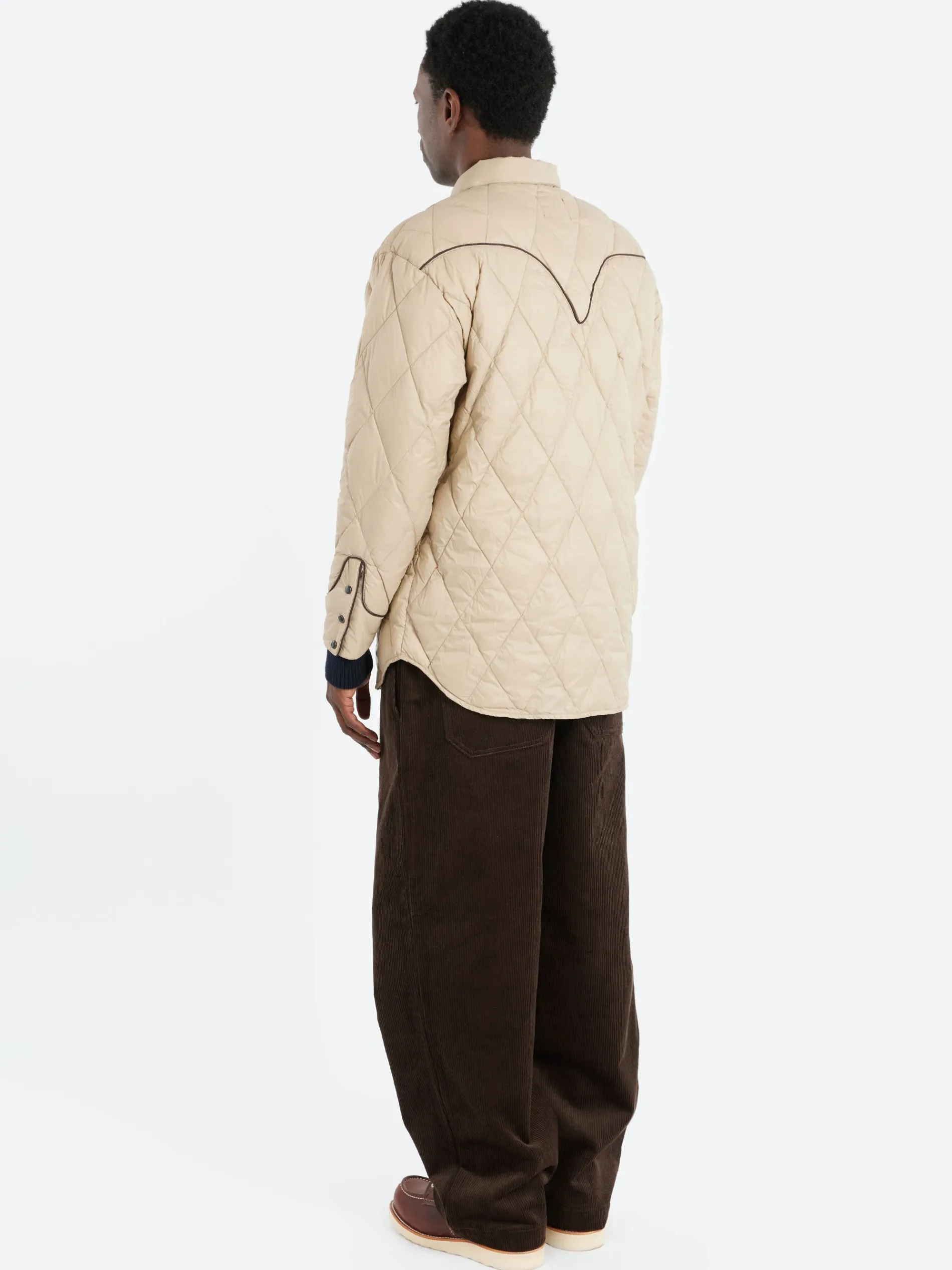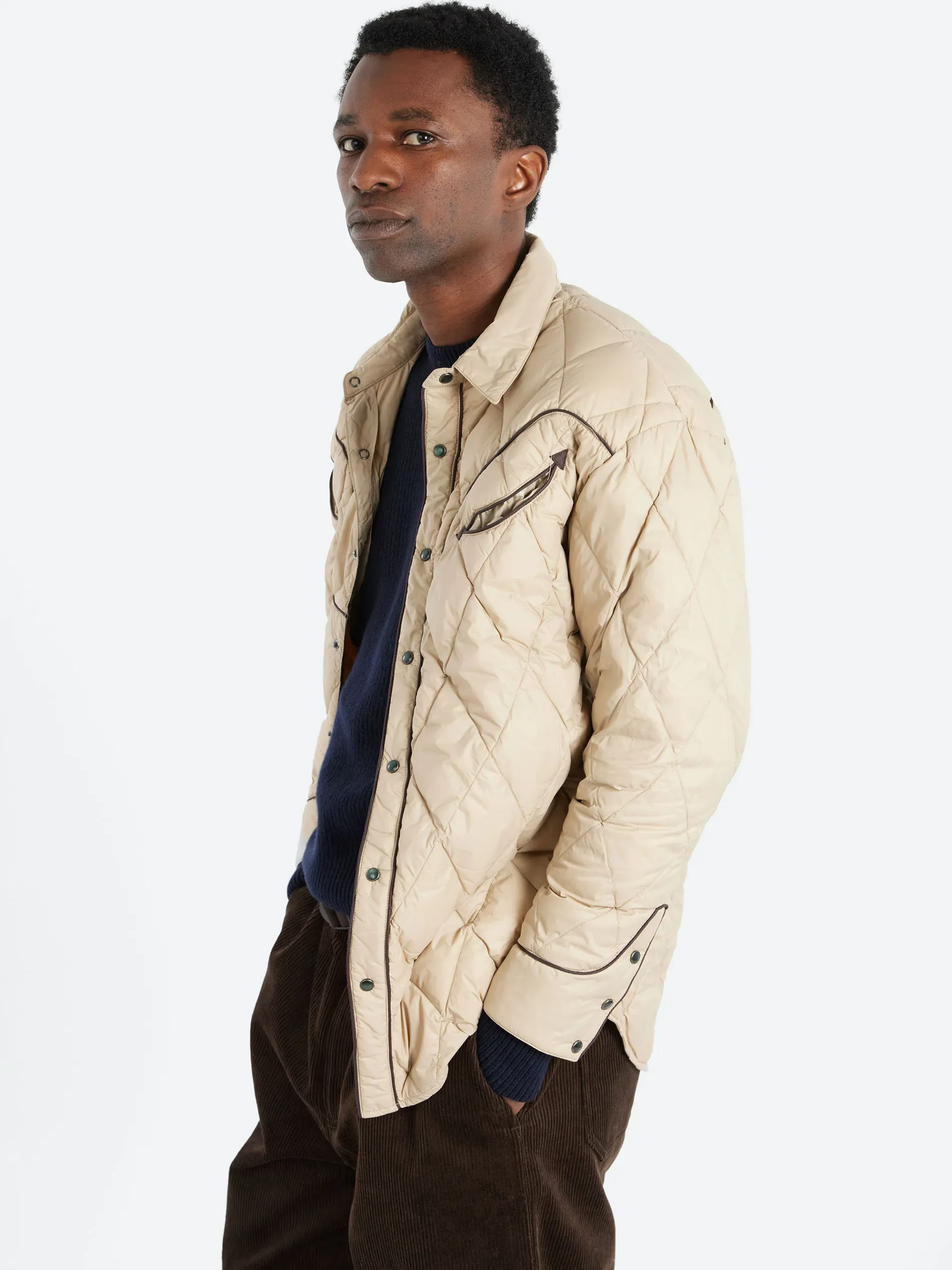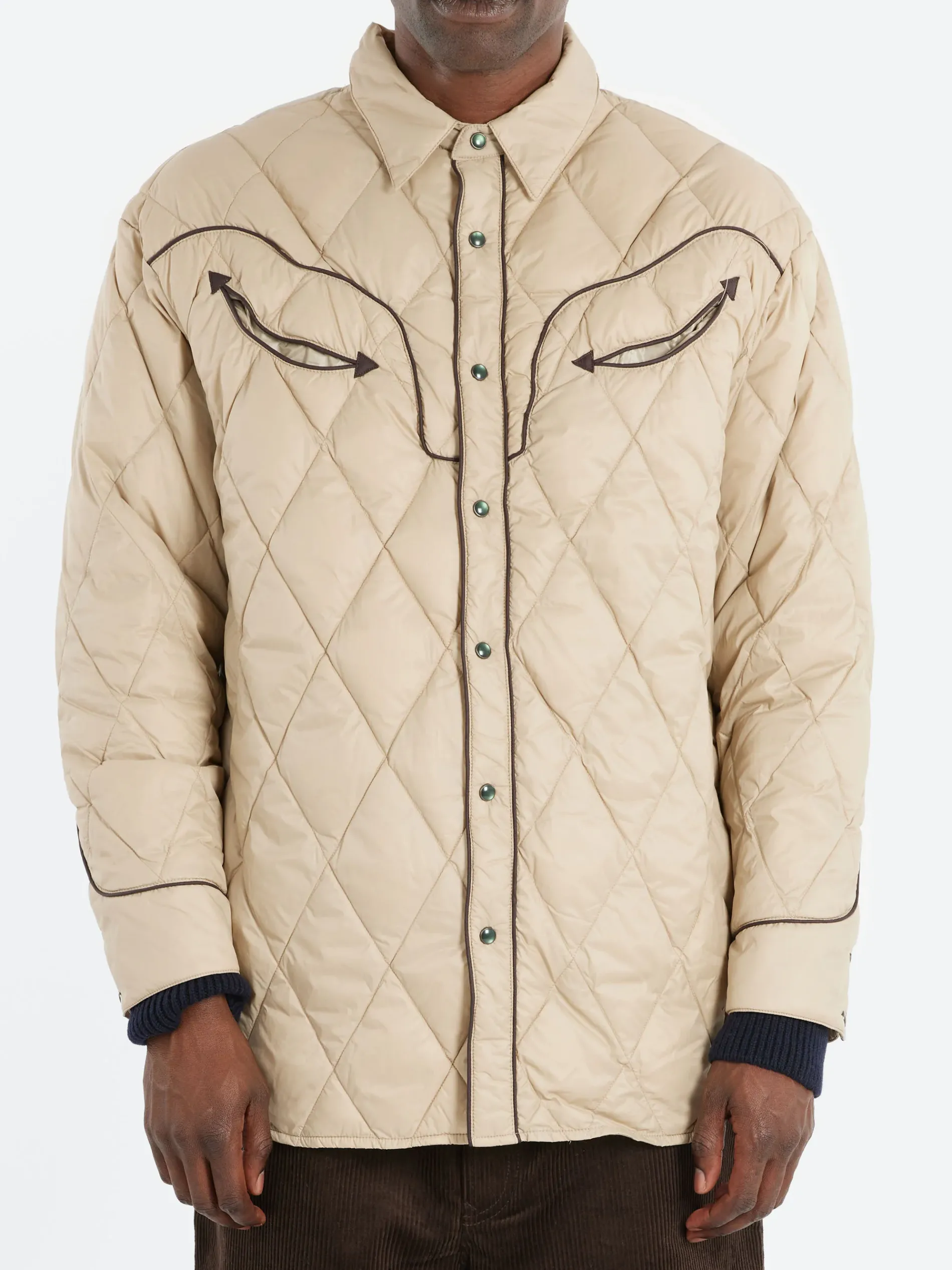 TAION shirt down jacket with western-style piping and diamond quilting. It can be stored compactly and is convenient to carry. Perfect for going out and traveling.