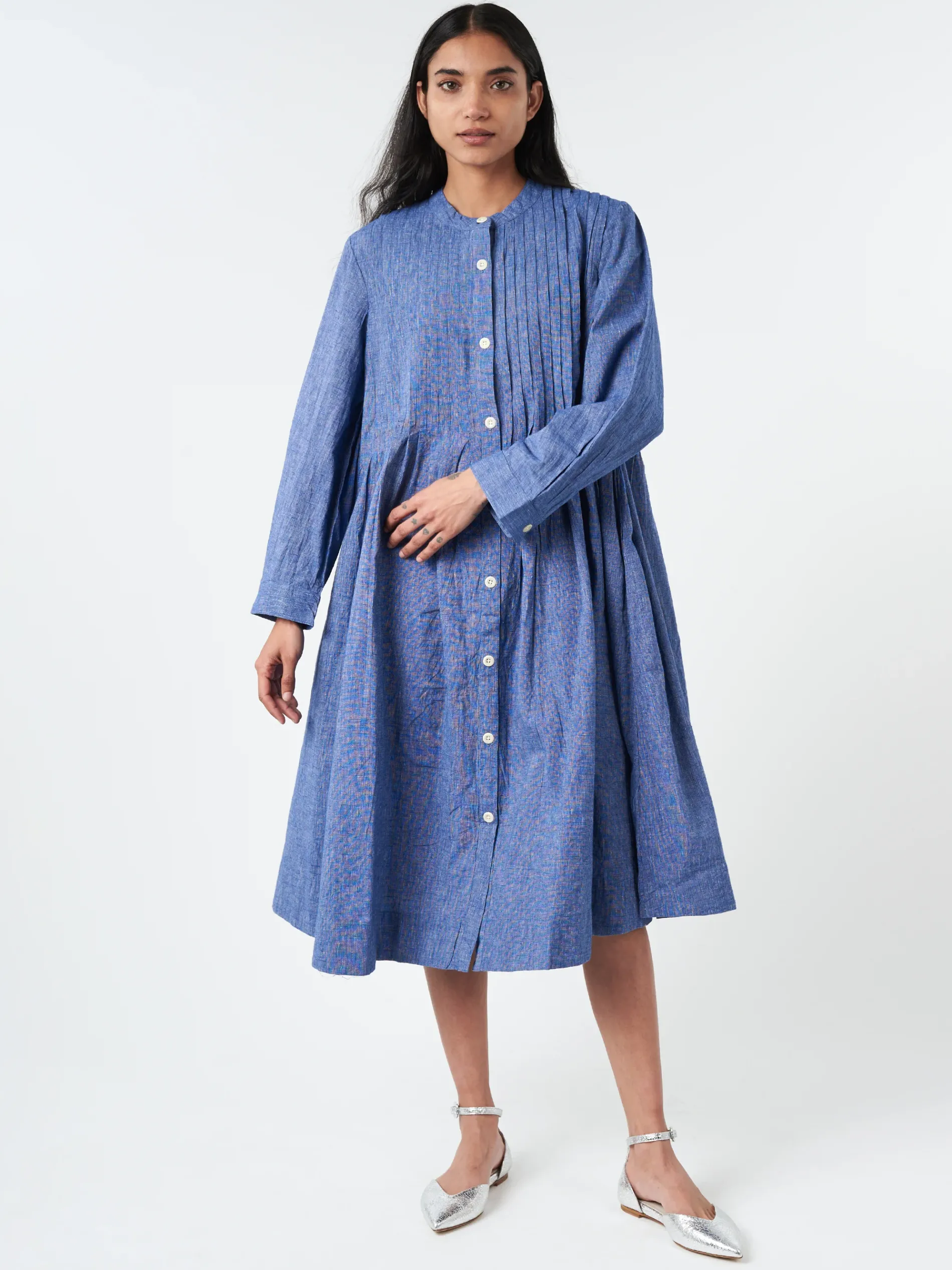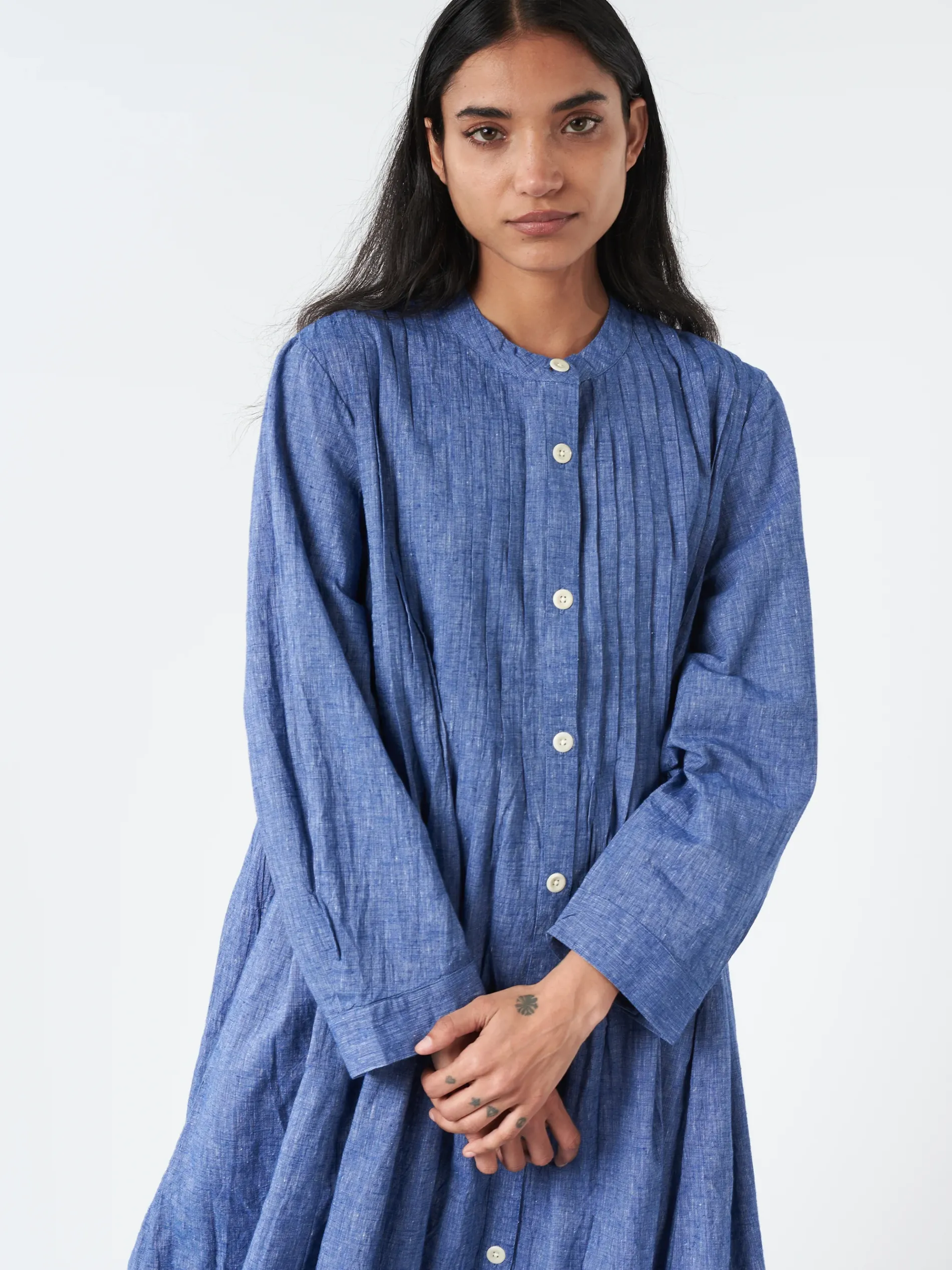 TOAST effortless dress is crafted from slubby cotton and linen-blend chambray which is soft against the skin. Punctuated by countless pintucks running down the front and back yoke, giving volume to the swingy shape.