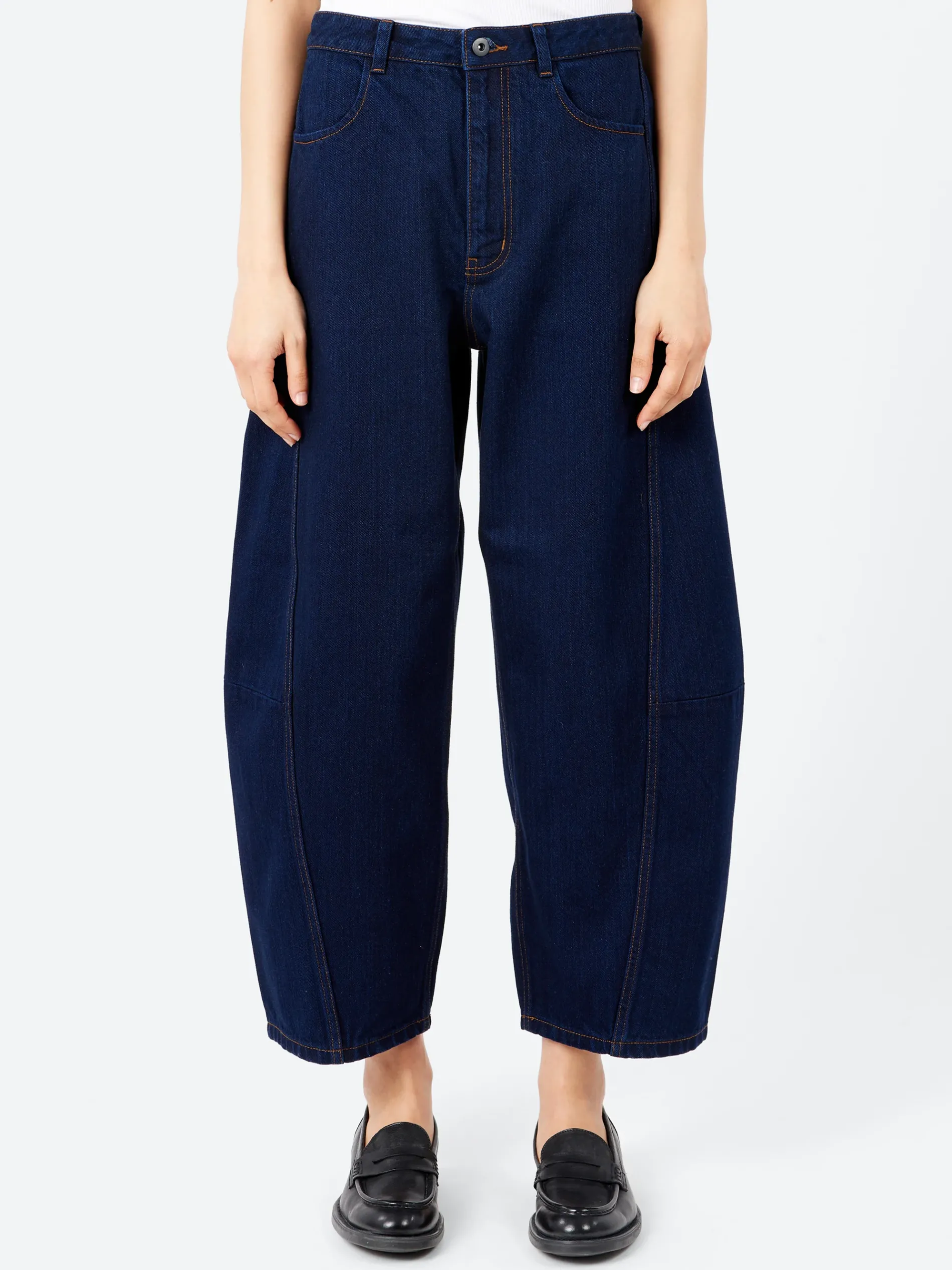 TOAST barrel-leg trousers are made by stitching panels of organic Japanese Kuroki denim, creating a twisted silhouette. Founded in Ibara, Okayama in 1950, Kuroki Mills is one of only a few denim producers with integrated dyeing, weaving and finishing facilities. With a high waist, a metal shank button at the fly, and two back pockets.