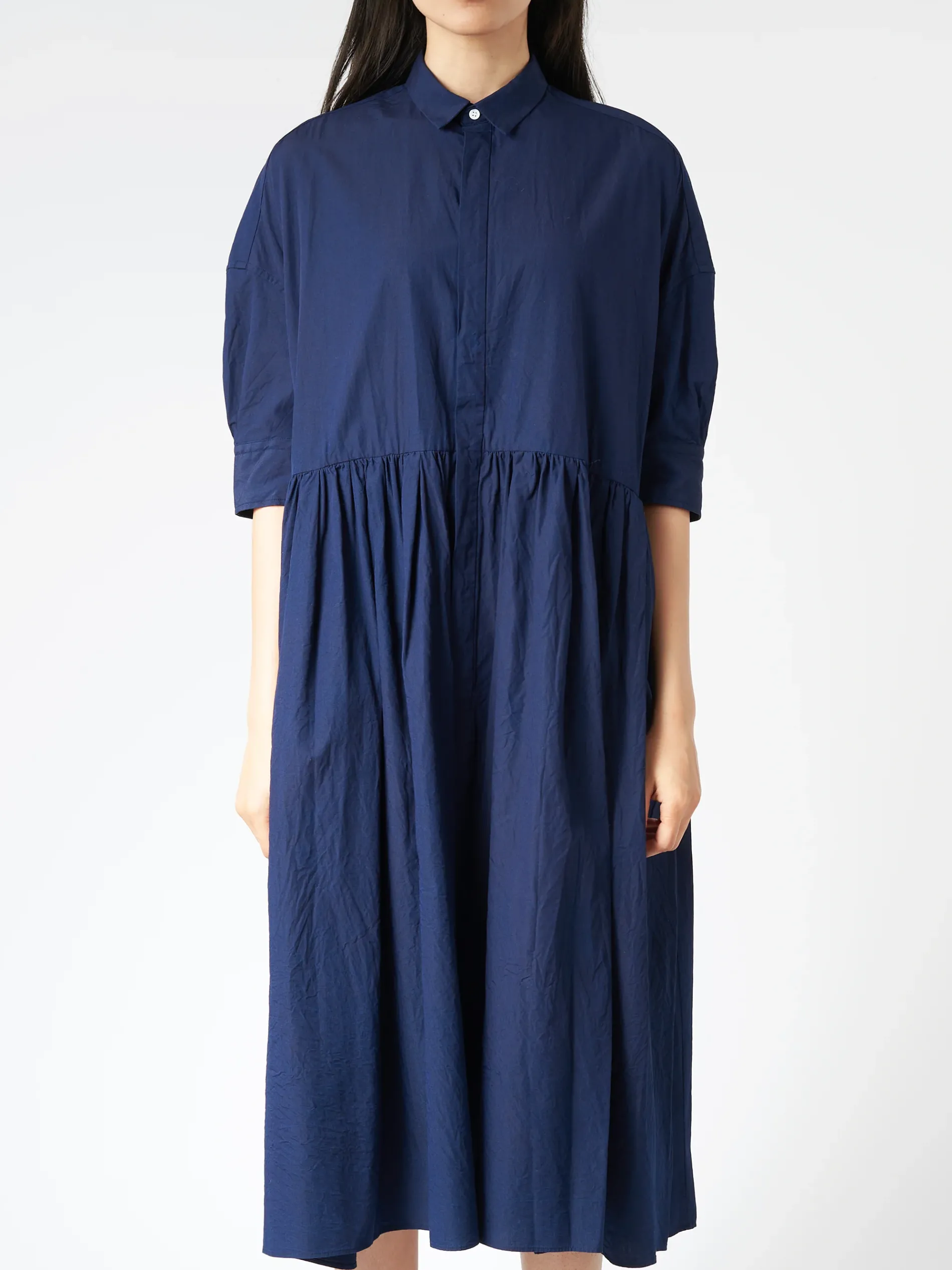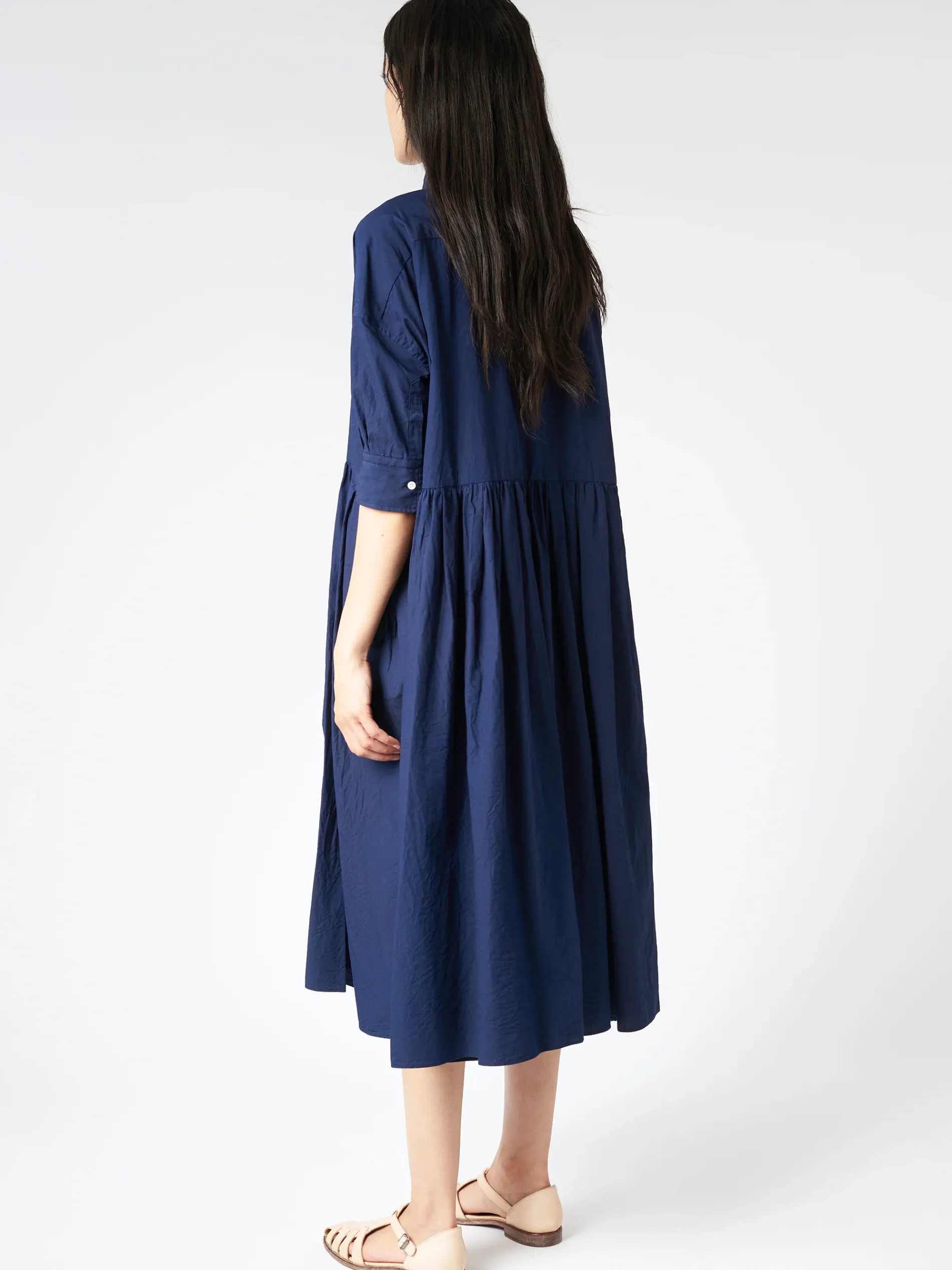 A classic shirtdress with soft pleats at the waist, made from fine cotton with a single exposed mother-of-pearl button at the neck.