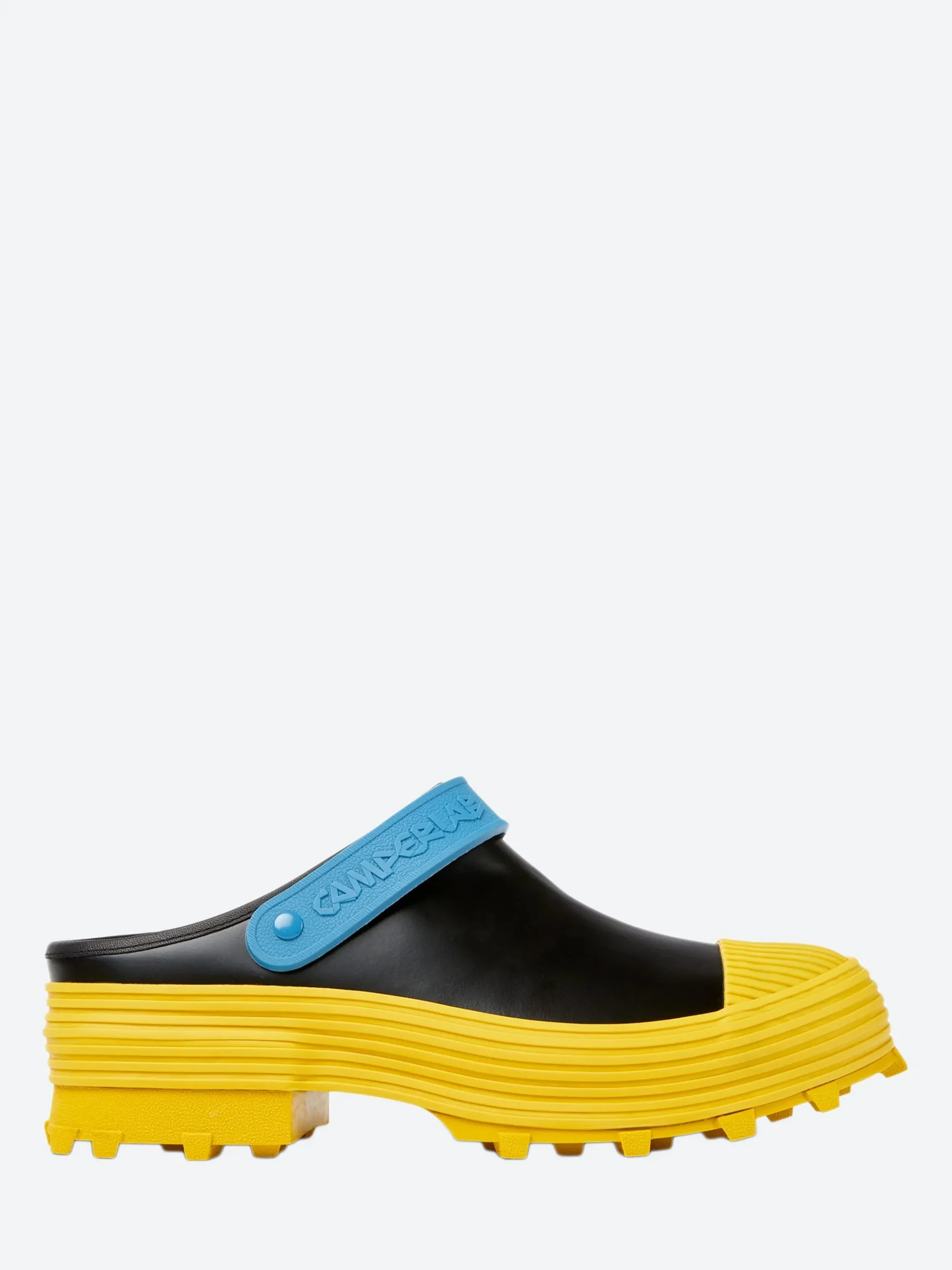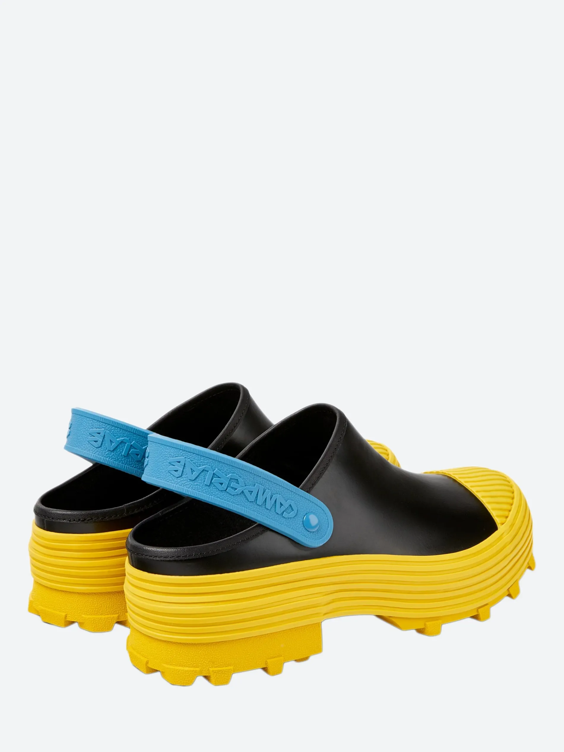 CamperLAB vulcanized leather clogs with slingback straps and toothed rubber outsoles.