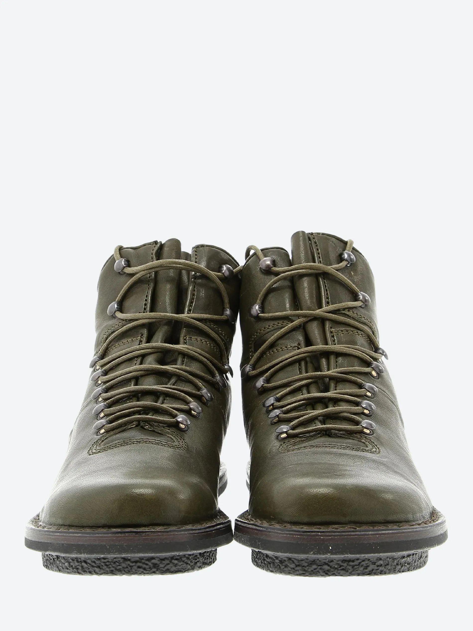 Trippen lace-up boot featuring hooks and eyes in the style of classic mountain boots.