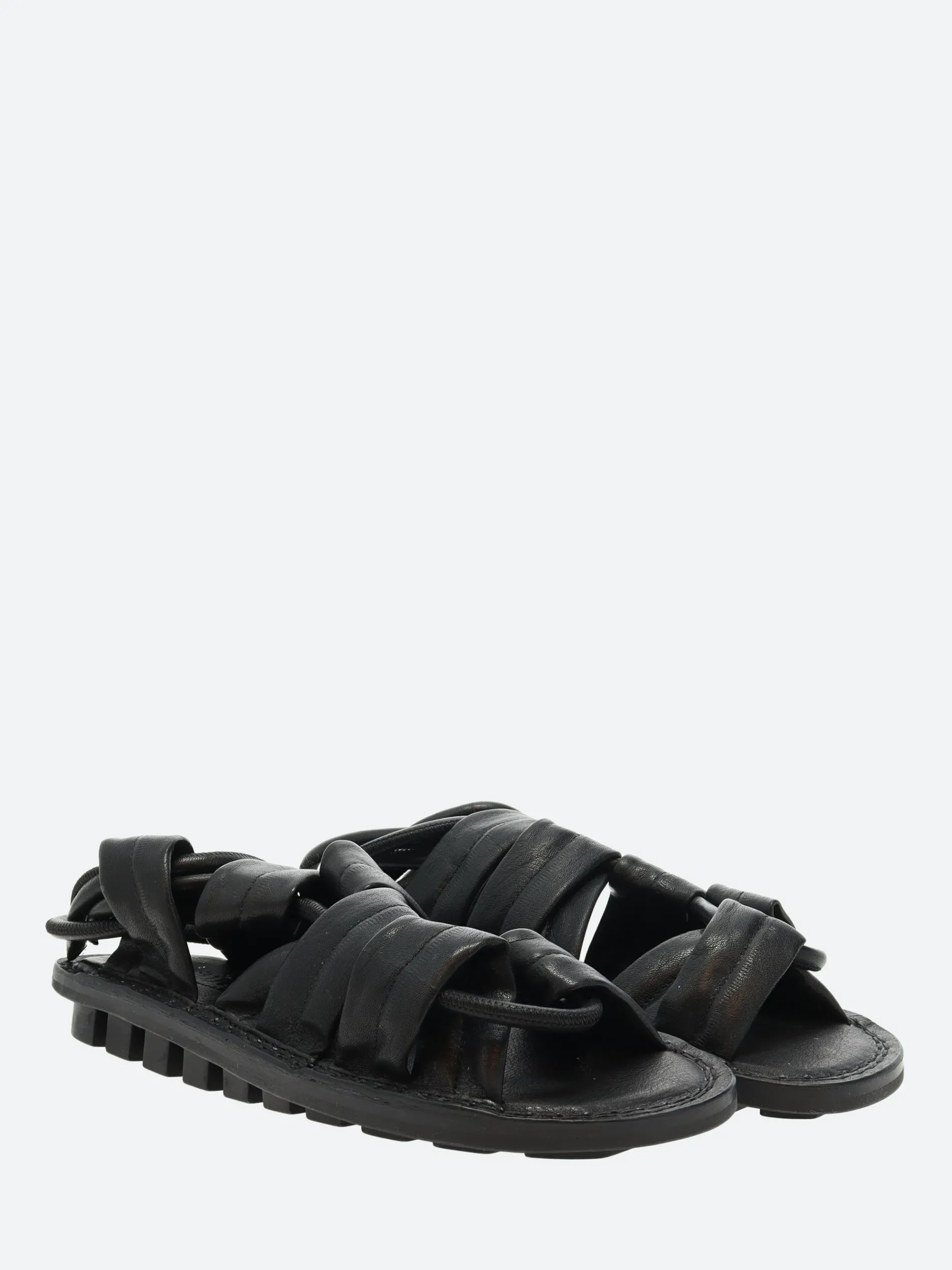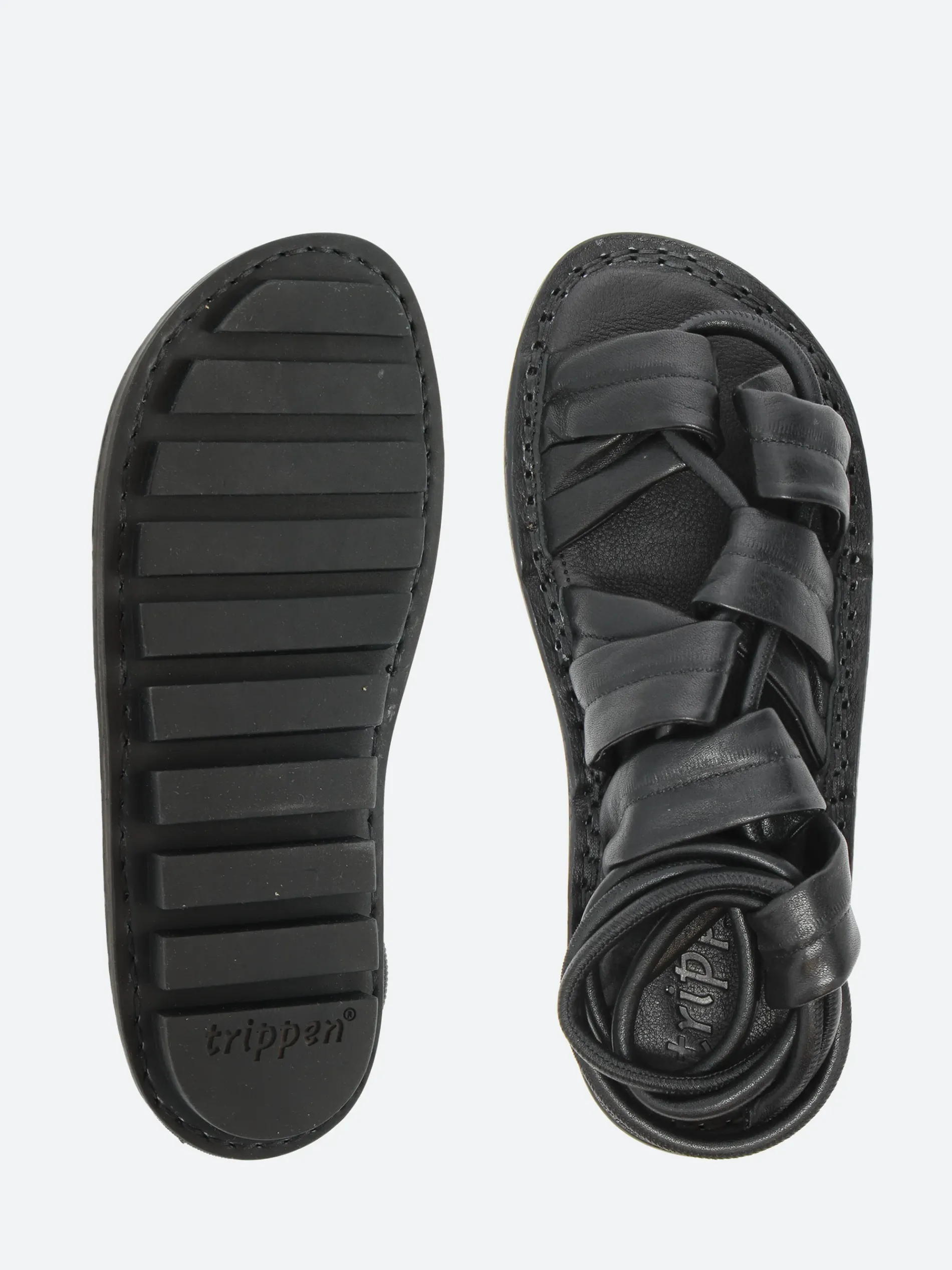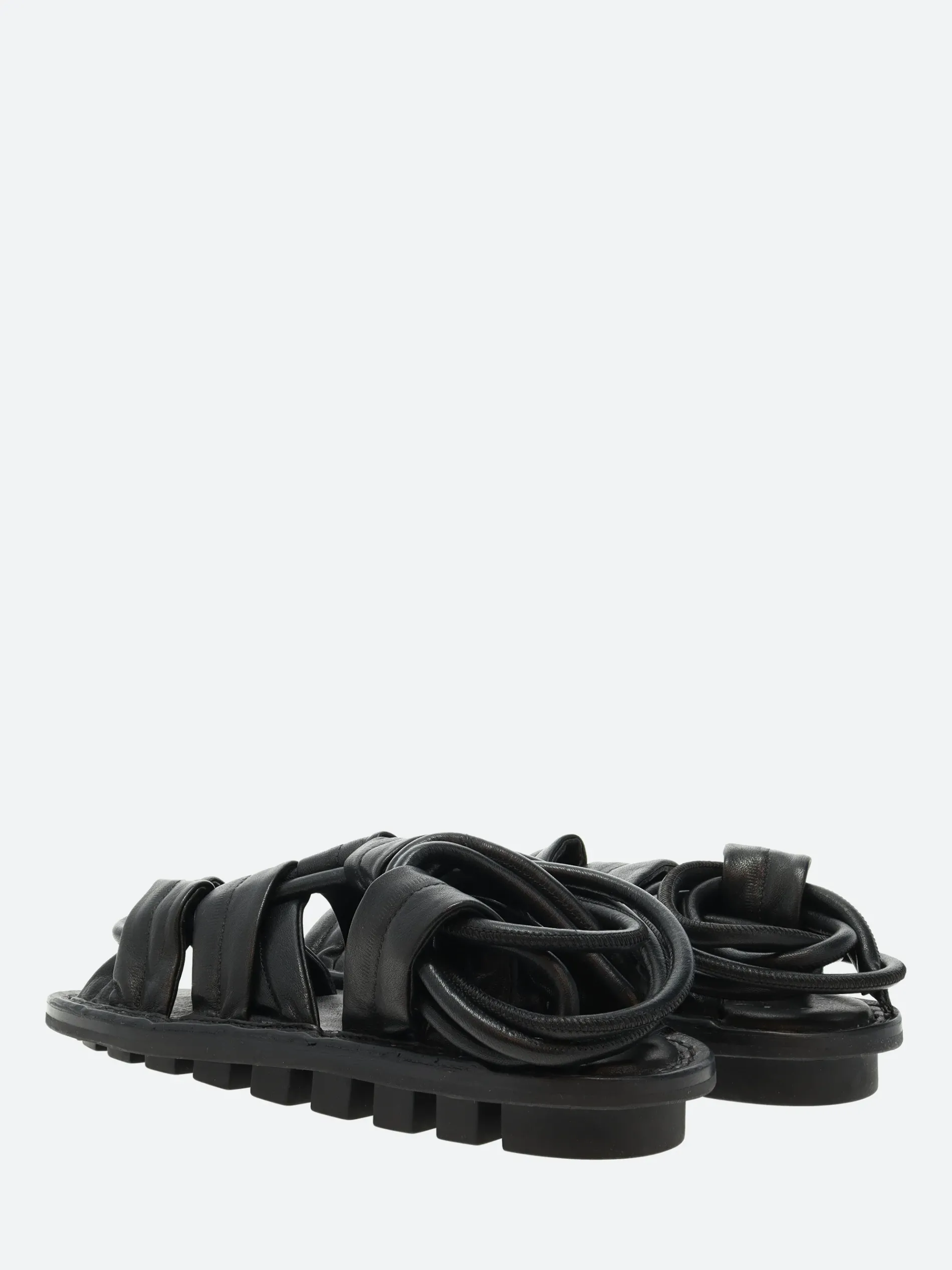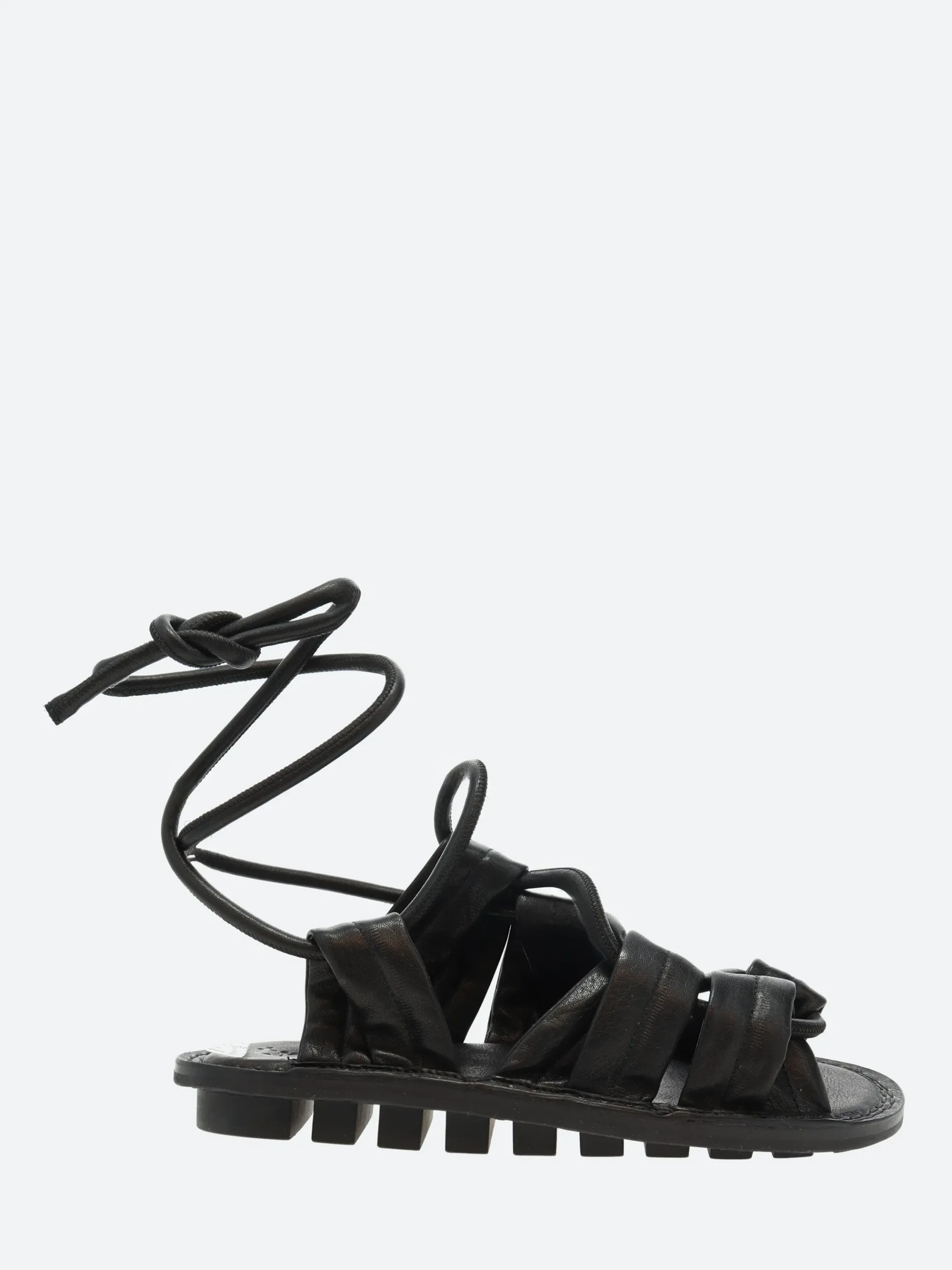 In an asymmetrical curved wave, a leather lace is passed through three soft leather loops on each side and tied up around the ankle.