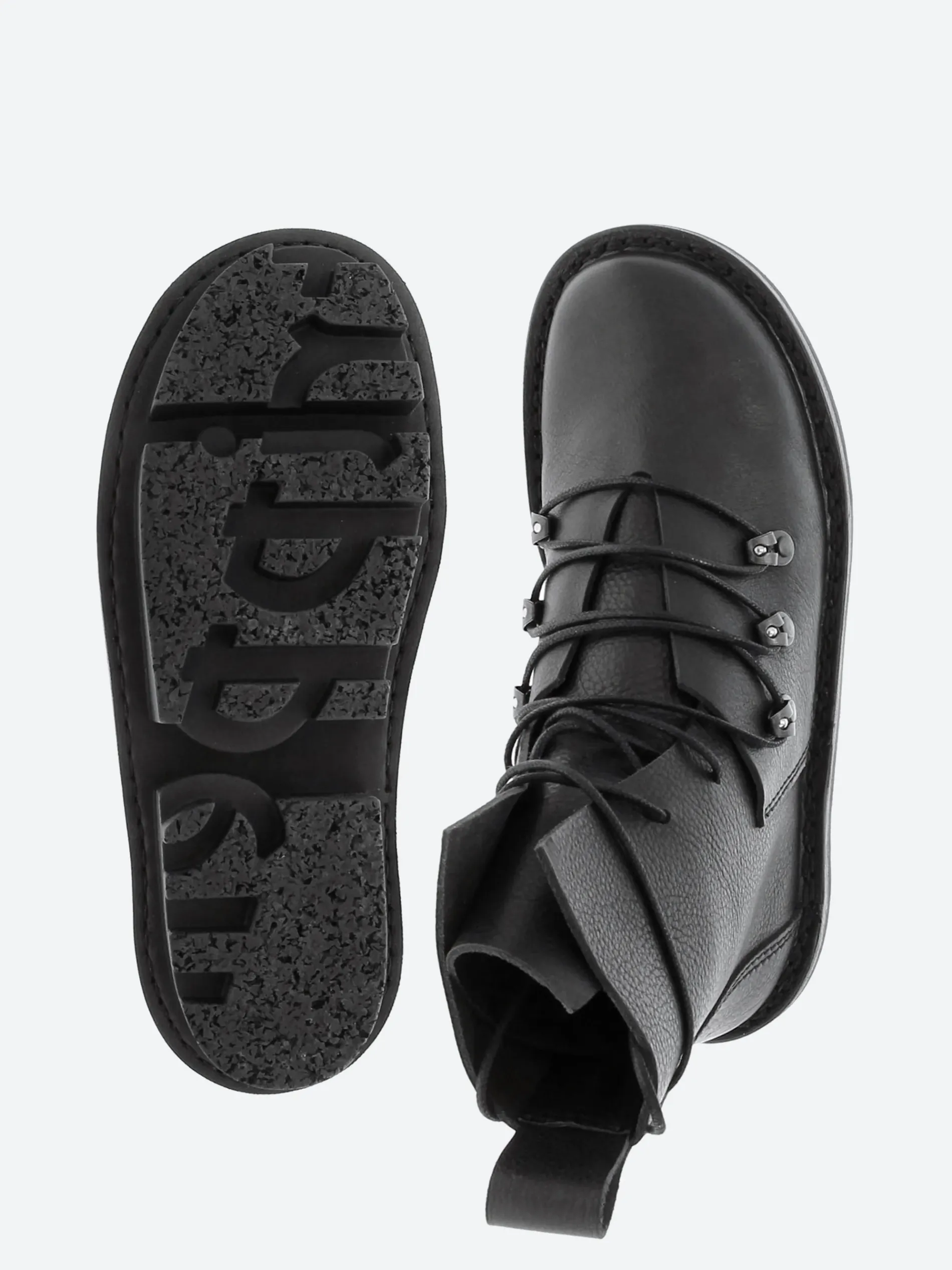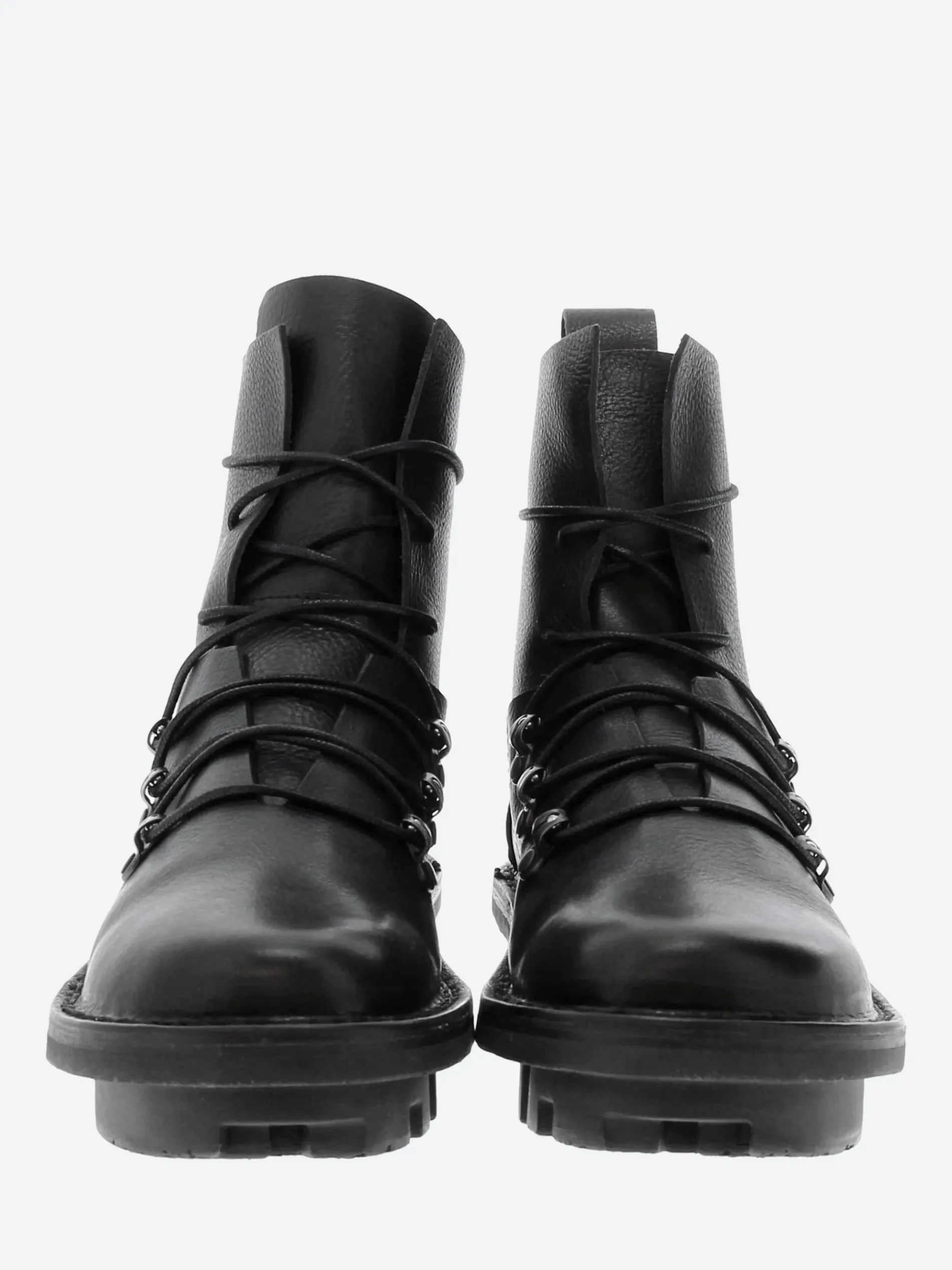 Rugged, lace-up boot with vertically stitched lines and an open, deconstructed form.