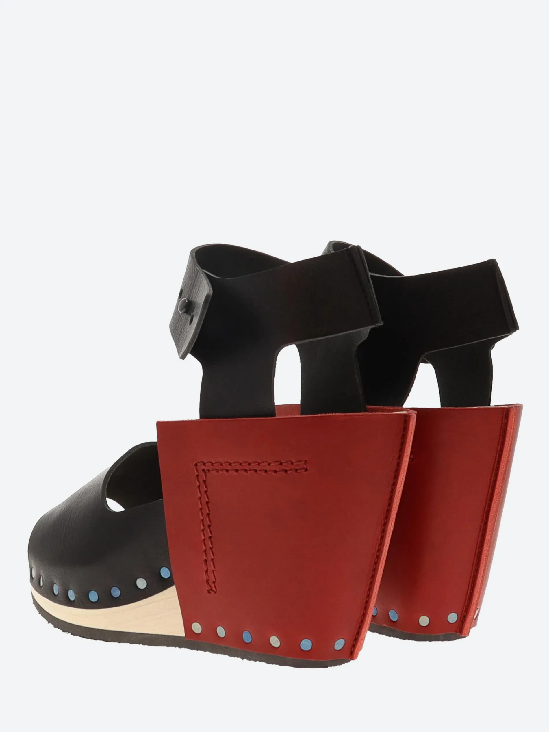 Trippen Wood Stand, this simple sandal on a high wooden sole is characterized by a dominant rectangle of leather wrapped around the heel.