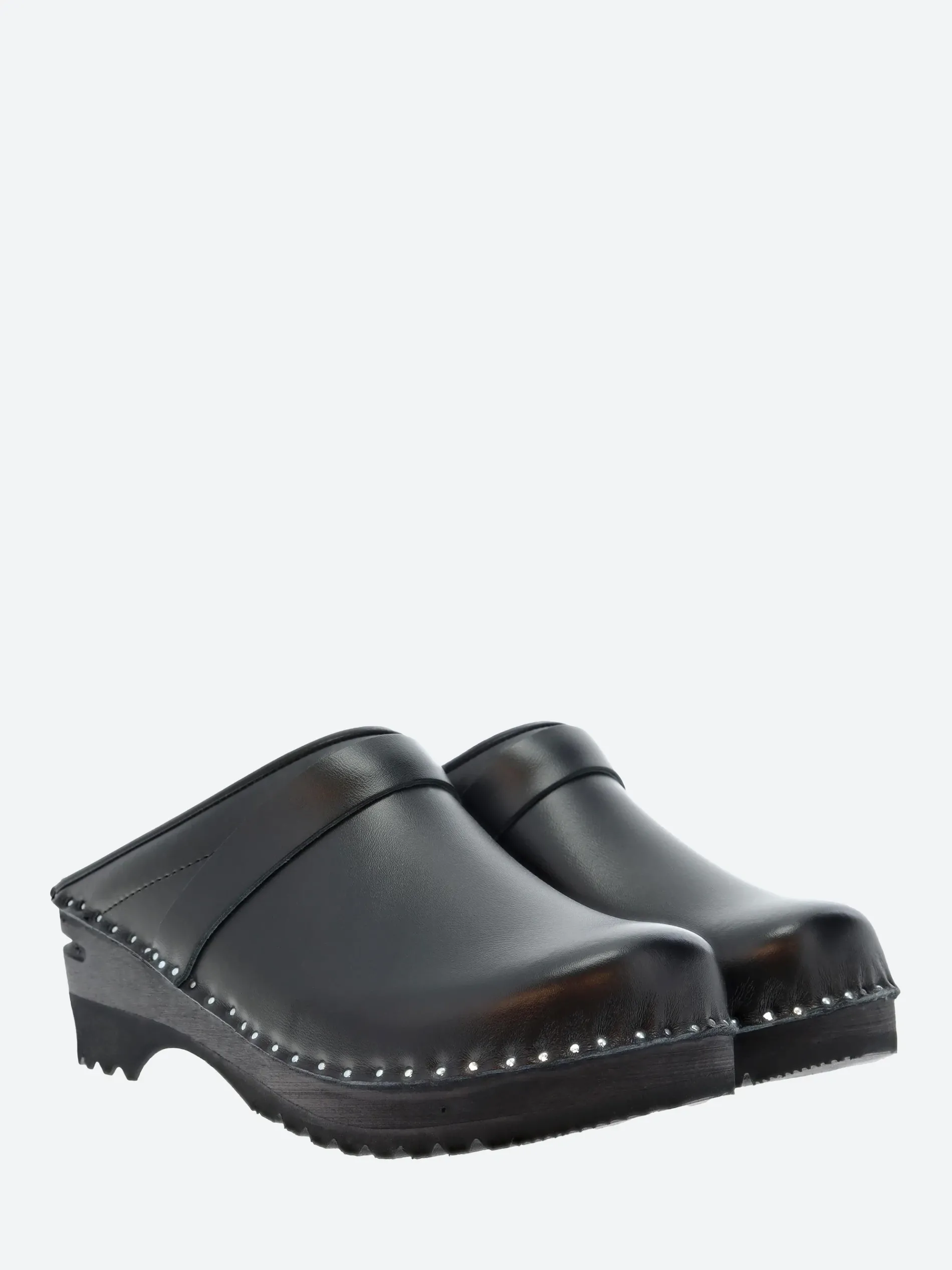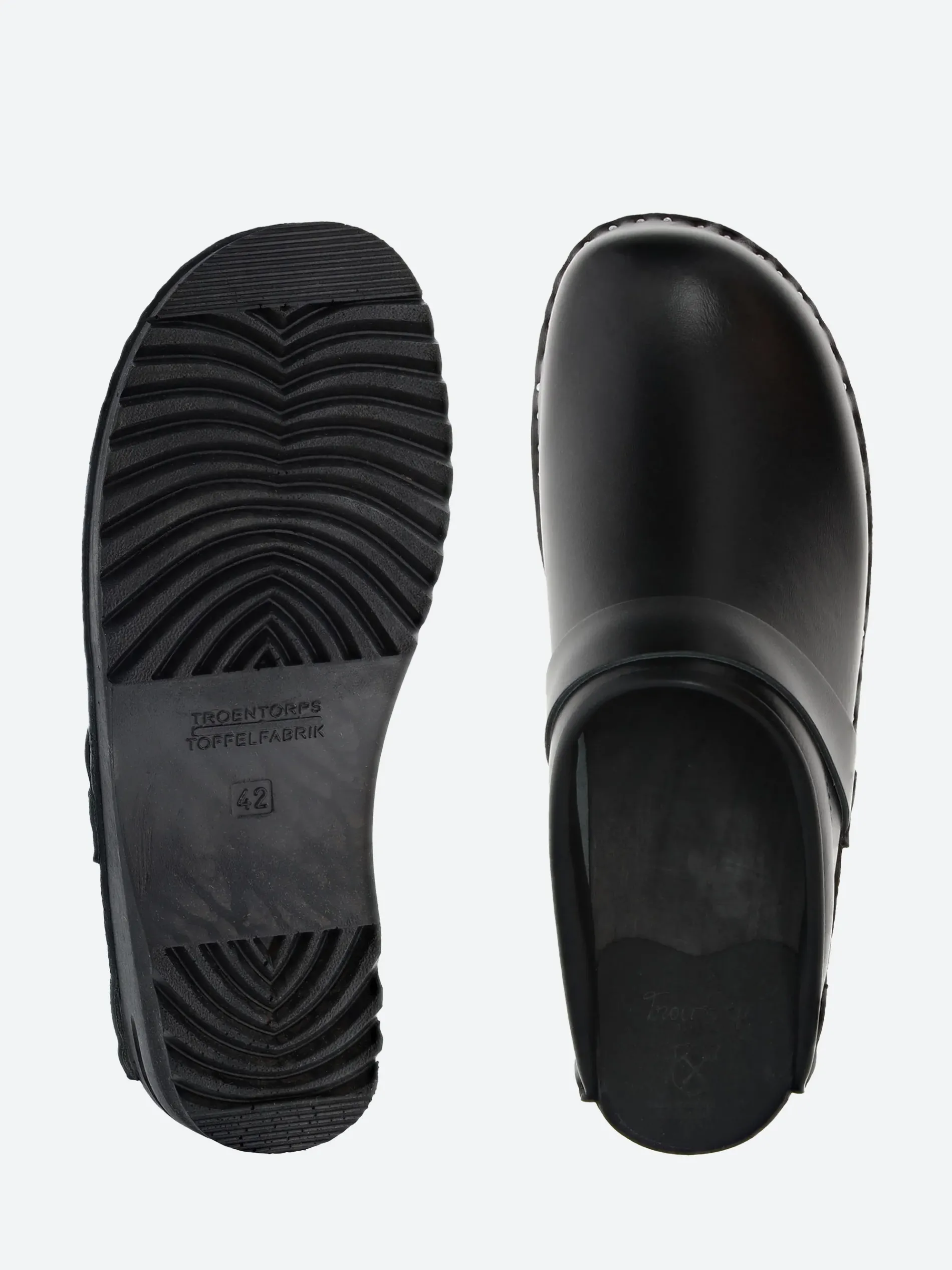 Troentorp Chef clogs has been a popular clog among chefs for years. Here it comes in black leather on black stained ideal bottoms.