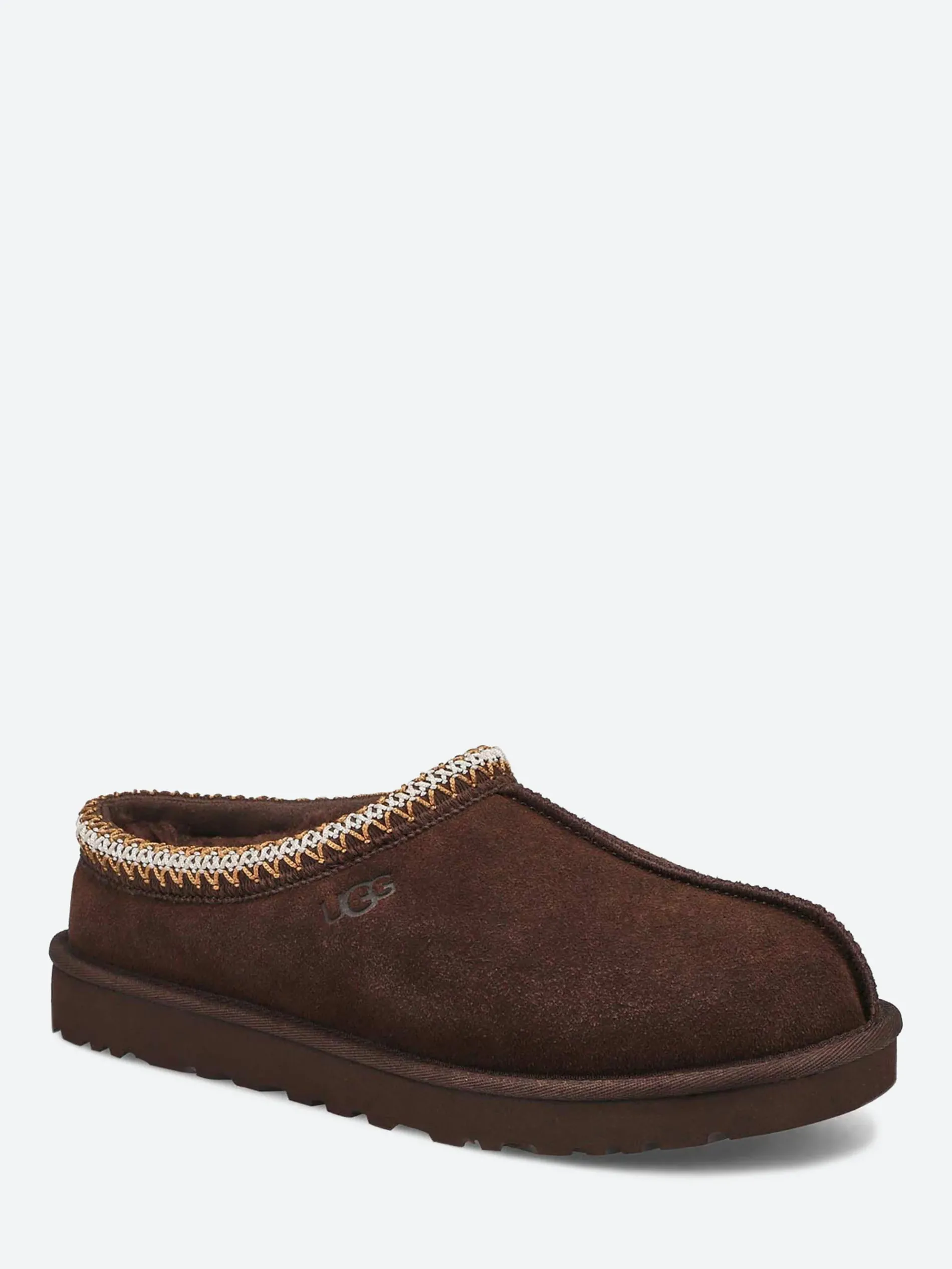 UGG slipper lined with plush sheepskin and upcycled wool, it’s crafted from soft suede with an embroidered braid and an easy slip-on silhouette.