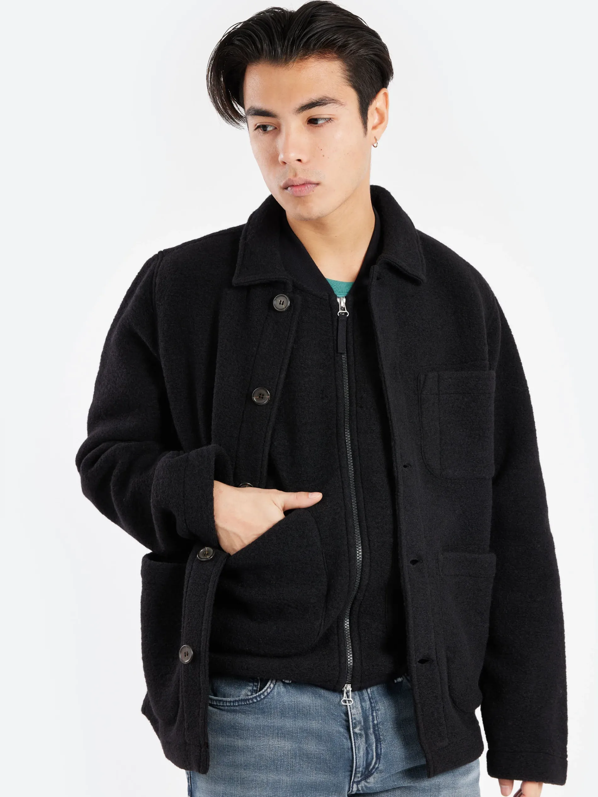 A loose, boxy fit simple jacket with three patch pockets, made from a luxury wool-blend fabric.