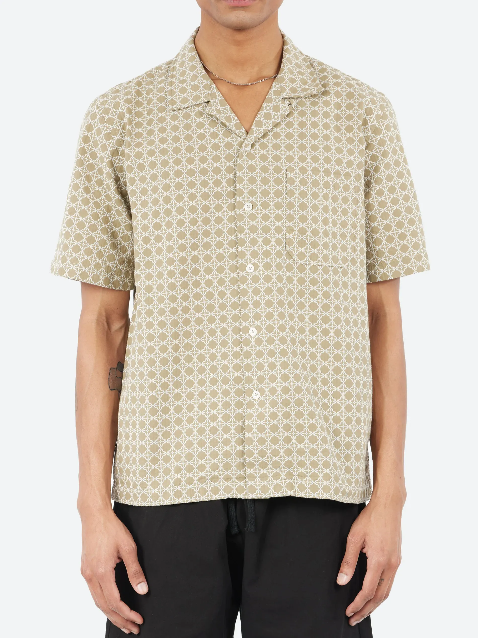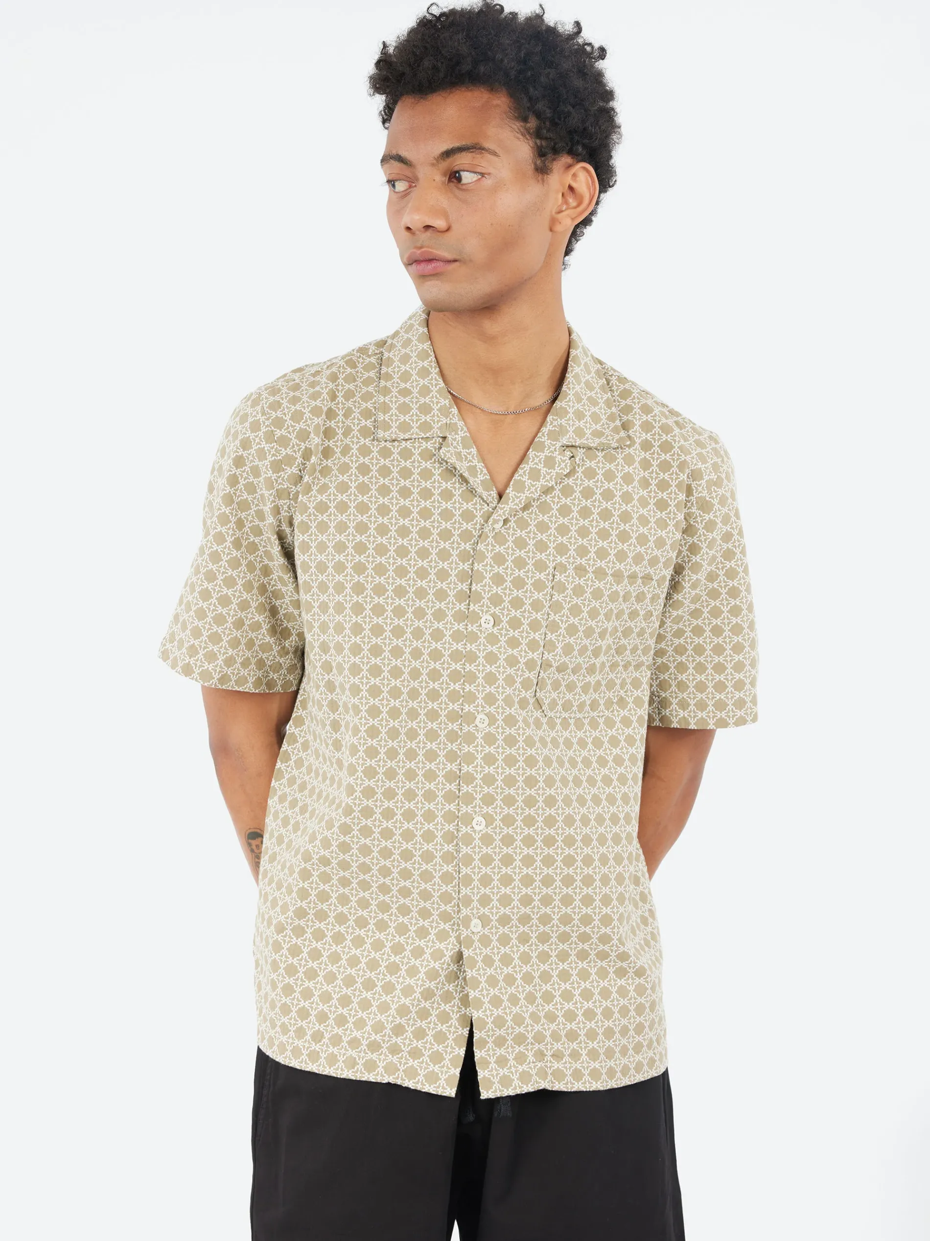 With a sharp, regular fit and a loop-close top button designed to be worn open-necked, but with the option to button it up for smarter styling. With a straight hemline and a front patch pocket.