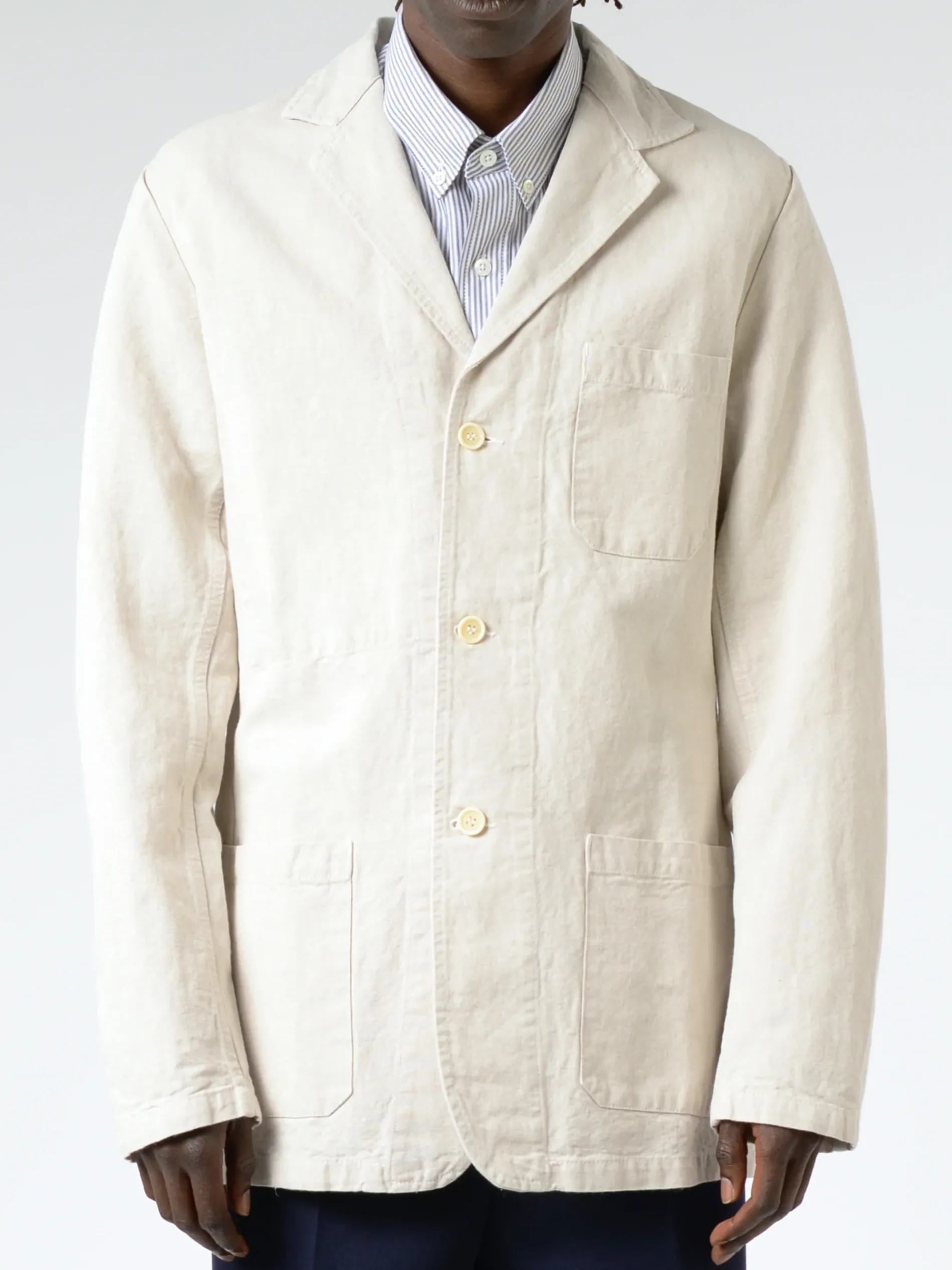 Vetra cotton and linen blazer recalls the authentic and solid canvas used for jute bags before being adapted for chore jackets. This style fits summer temperatures and epitomizes soft tailoring.
