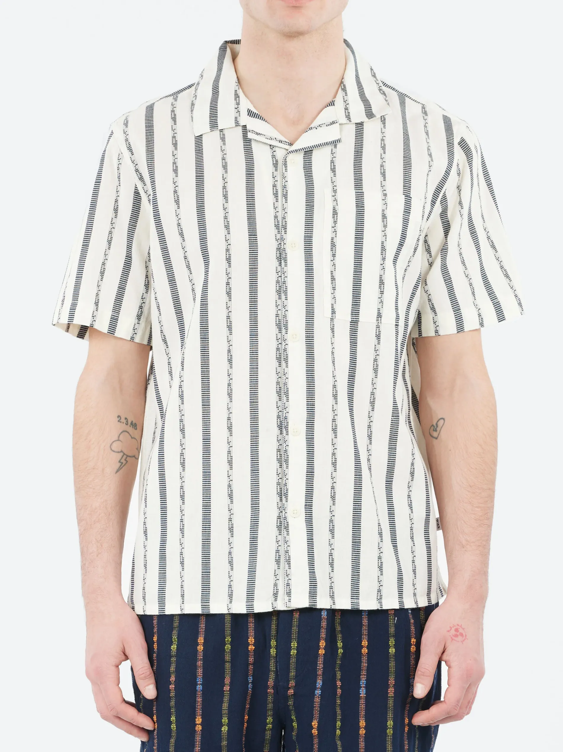 Wax London staple Didcot short-sleeve shirt makes a triumphant return for SS25. Cut for a relaxed, breezy fit, this ecru version is made from an 100% organic cotton and features a woven broken navy stripe design.