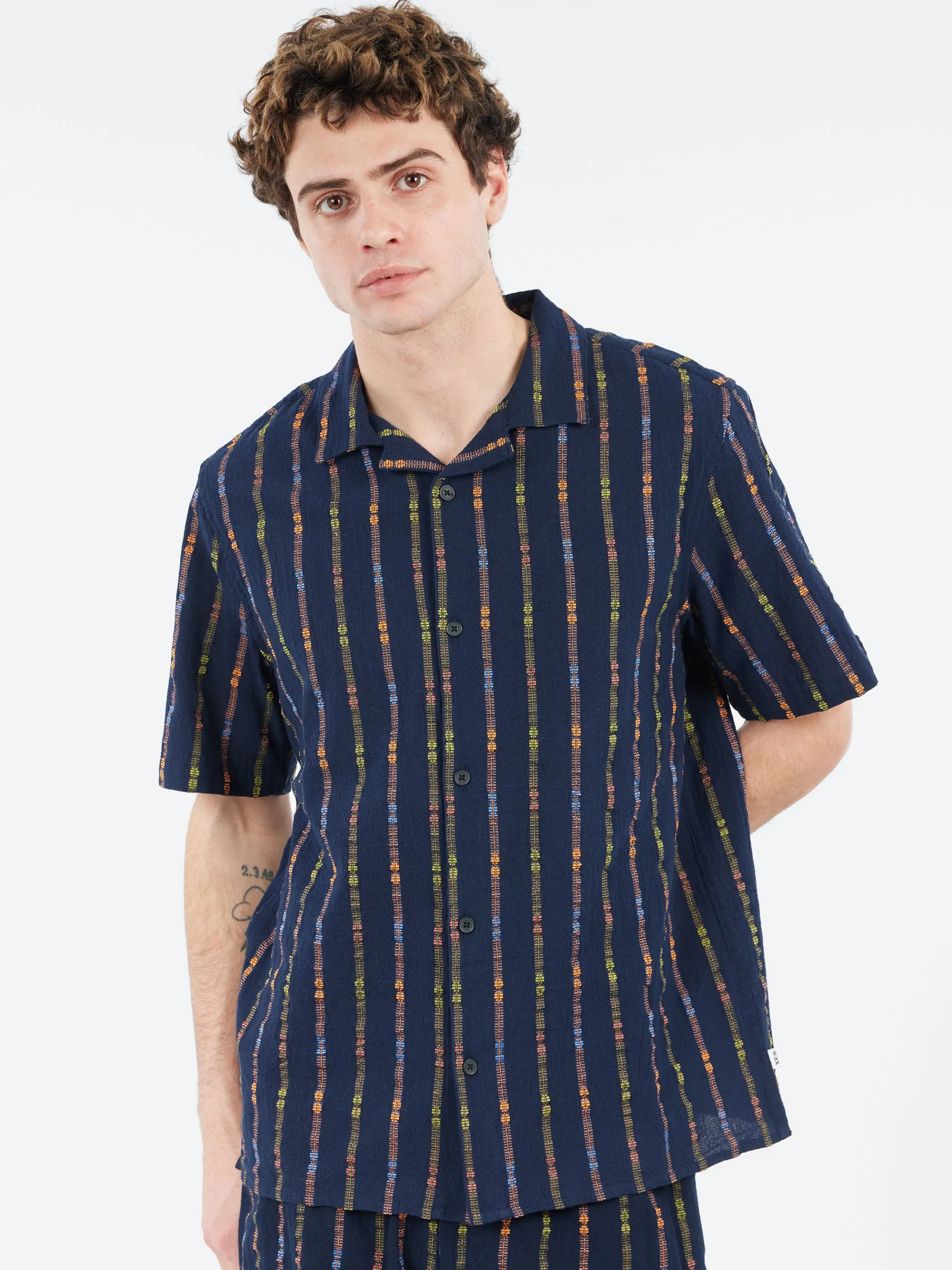 Wax London staple Didcot short-sleeve shirt makes a triumphant return for SS25. Cut for a relaxed, breezy fit, this version is made from a textured cotton blend and showcases a dobby stripe design with bright colored blue, orange and yellow yarns.