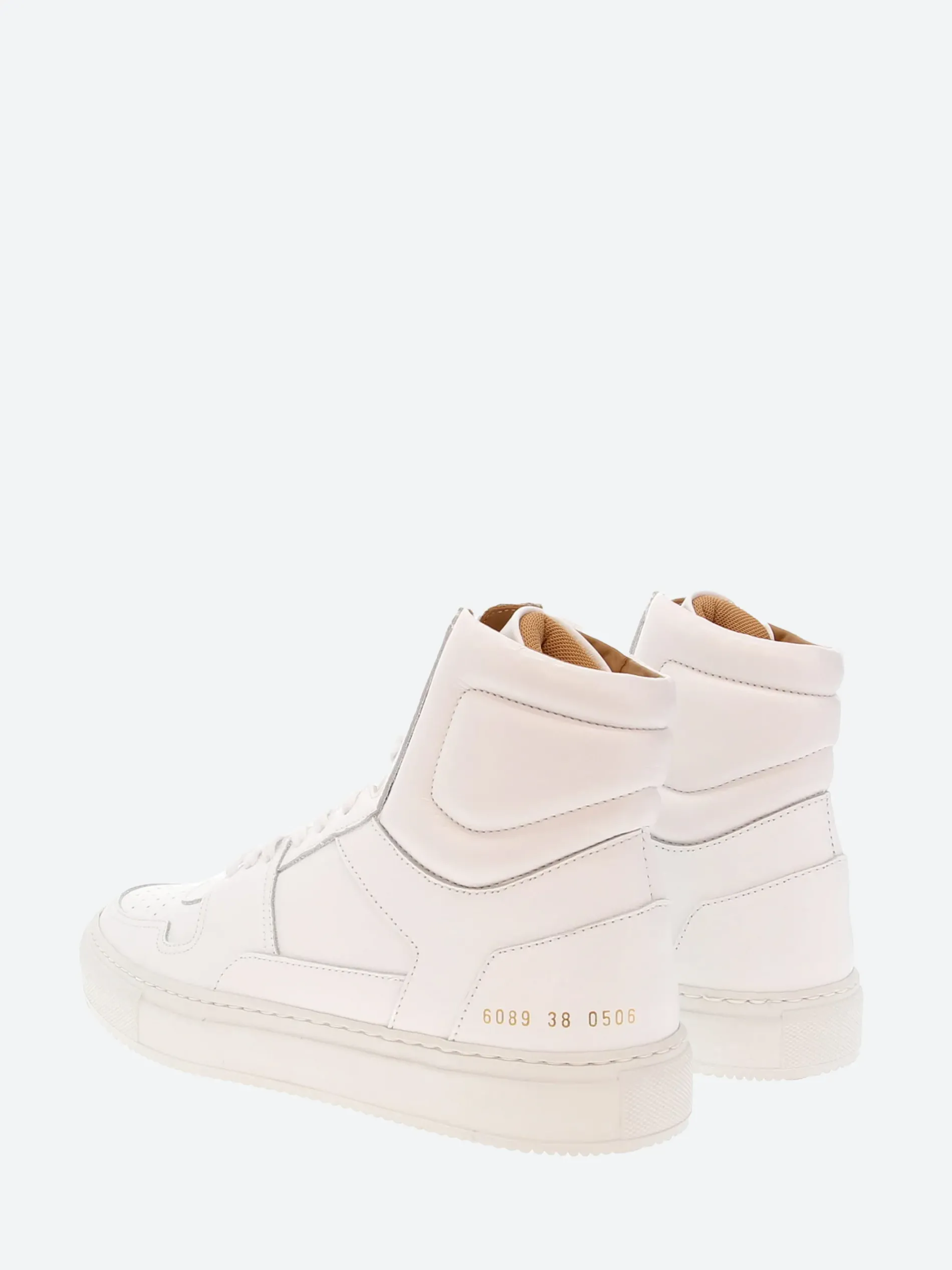 Woman by Common Projects lace-up high top sneaker. Using top grain leather for the upper and a full leather lining makes this a luxury Italian made sneaker. The clean lines and minimal gold branding exemplify everything the brand stands for.