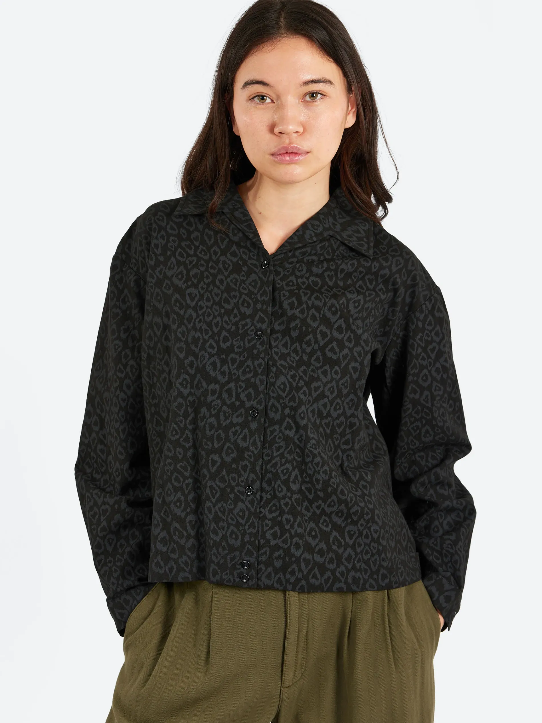 A boxy-fit long sleeve shirt crafted from an Indian cotton-linen blend, featuring a tonal leopard print design for a subtle yet striking look. The shirt has a grown-on collar, adding a seamless, modern touch to its design.